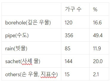 사실 내가 한 말은 다 배부른 소리다. 가나에서 모두가 언제든지 깨끗한 물을 마시는 것은 아니란 것을 알기 때문이다. 그럼 실제 가나 사람들은 식수를 어떻게 마시는 것인가? 가나 볼타(Volta)의 두 농촌 지역(Ho West 및 Adaklu)에서 무작위로 선정된 720 가구에게 묻고 얻은 답을 찾았다. 2022년에 작성된 것이니 그리 오래되지 않았다.