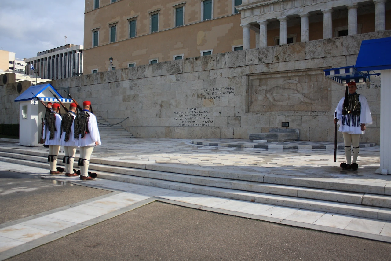 지하철역을 내려 신타그마 광장으로 갔다. 마침 11시가 되어 의회 앞 근위병 교대식을 구경했다. 영국의 근위병 교대식을 떠올리면 안 된다. 다섯 명의 군인이 슬로 모션으로 느릿느릿 걸었다. 저 움직임에 뭔가 의미가 있을 텐데… 검색해 볼 열정은 없었다. 움직임의 타이밍이 조금씩 어긋나 군인 특유의 절도는 느낄 수 없었다. 네 명의 아이들은 이내 관심을 잃고 비둘기 밥 주는데 전념했다.