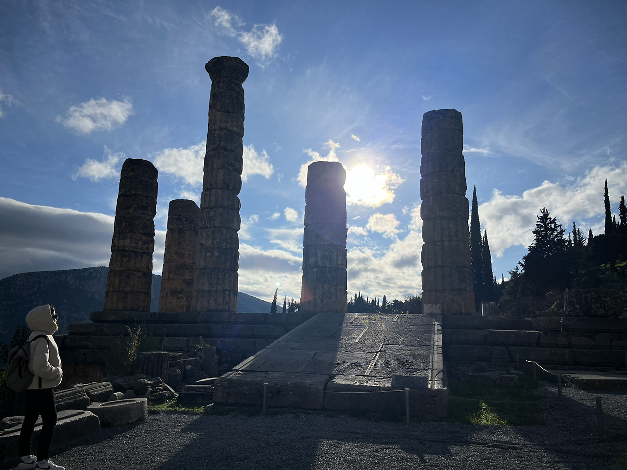전날 비가 쏟아지는 바람에 가지 못했던 델피를 부족한 시간을 쪼개 들리기로 했다. 델피로 향하는 길 위에서 다시 상서로움을 느꼈다. 구름을 뚫고 햇빛 몇 줄기가 조명처럼 땅을 비추었다. 멀리에는 알프스에서 보던 설산이, 가까이에는 올리브 나무를 품은 구릉이 있었다. 햇빛을 반사해 반짝이는 바다를 바라보며 구릉을 끼고 난 길을 달렸다. 그동안 내가 설산과 초록산과 바다를 한눈에 담은 적이 있었던가. 과히 수많은 고대 신을 창조해 낼 영감을 주는 자연이었다. 때마침 메마른 돌산을 배경으로 무지개가 나타나 더욱 특별한 시간이었다.
