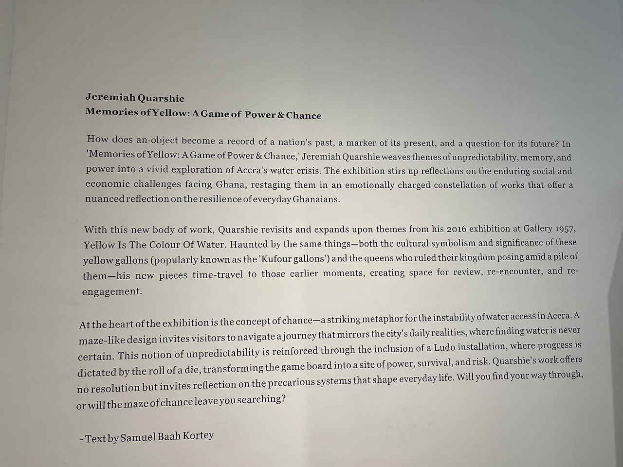 캠핑스키호텔에 위치한 갤러리 1957을 먼저 찾았다. 제레미 콰시라는 작가의 개인전이 열리고 있었다. 아크라의 만성적인 식수 부족 문제를 작품으로 표현했다. 빈부나 성별, 나이에 관계없이 모든 사람이 물 부족을 겪고 있다고 알려주는 것 같았다.