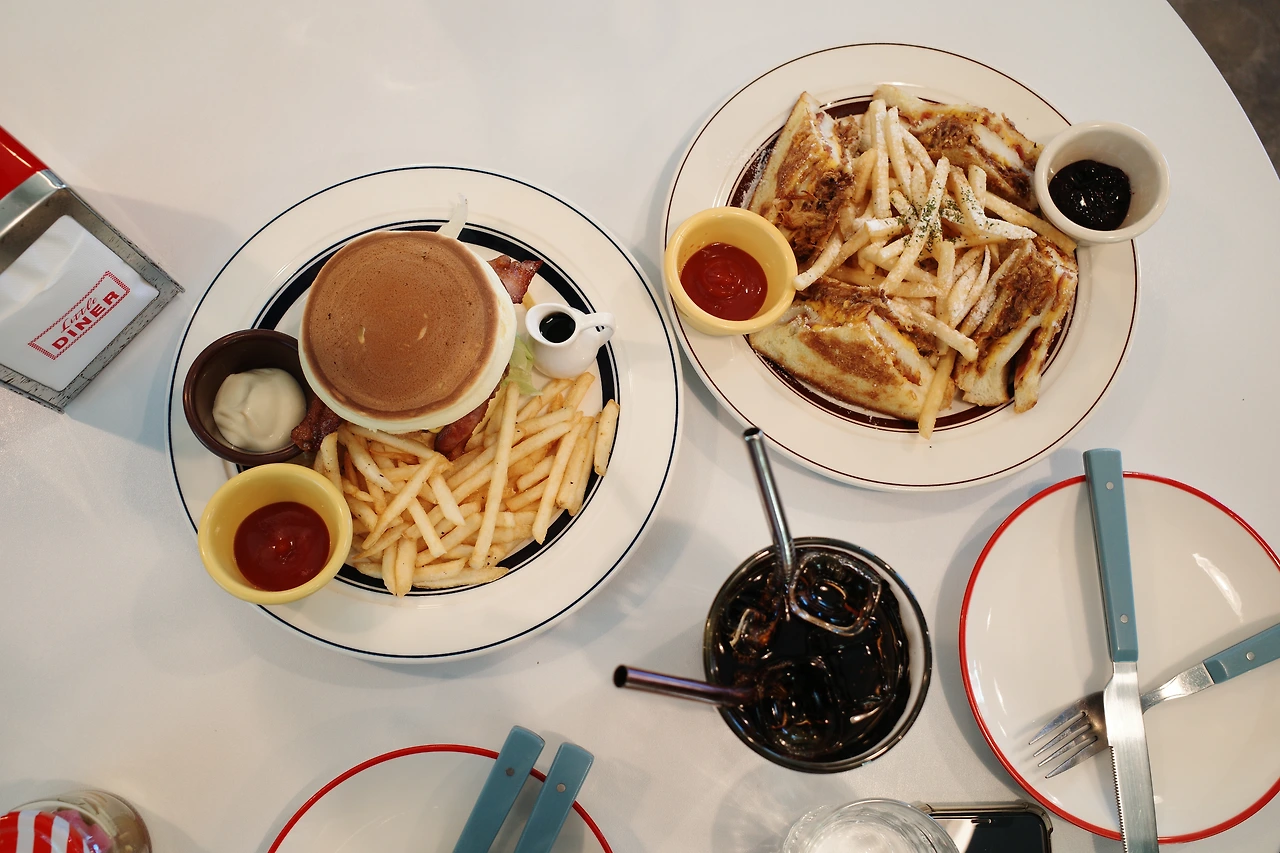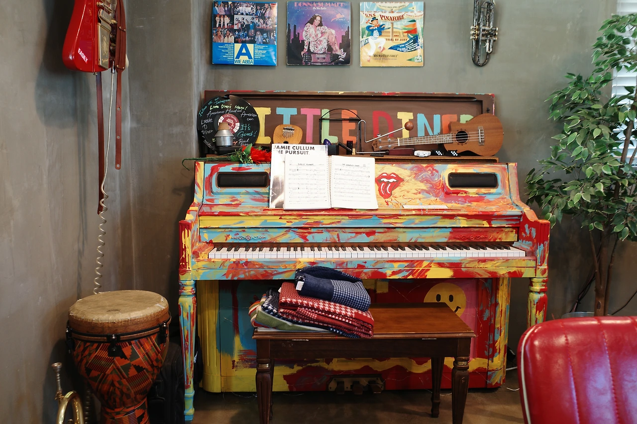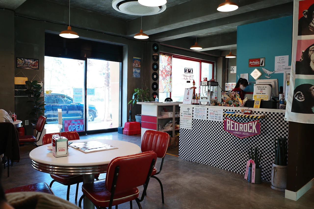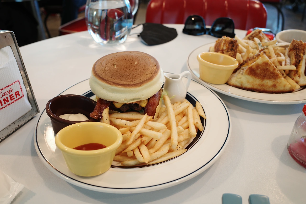 3시부터 브레이크 타임이라 그때까지만 식사를 할 수 있었다. 자리에 앉자 마자 미리 생각해두었던 ‘오리지널 팬케이크 버거’와 ‘풀드포크 몬테크리스토’, 콜라 한 잔을 주문했다. 이곳에서 식사를 할 수 있다는 안도감으로 그제야 천천히 매장을 둘러보았다. 알록달록 색칠한 피아노, 일렉트로닉 기타, 우쿨렐레, ABBA를 비롯한 각종 LP와 함께 커트 코베인의 사진, 키스 해링의 그림 등으로 벽을 가득 채운 인테리어는 레트로와 키치함이 공존해 기분 좋은 시너지를 내고 있었다. 미국의 로드무비에서 종종 보았던, 교외나 국도변 등지에서 위치해 자동차 여행객들이 간단한 요기를 할 수 있는 식당을 다이너(Diner)라고 부르는데, ‘리틀 다이너’라는 이름답게 미국의 감성이 느껴지는 새빨간 인조 가죽 의자와 테이블이 구비되어 있었다. 여긴 분명 강릉인데 이곳에 앉아 있으니 잠깐 미국 여행을 하는 것 같았다. 4인 테이블이 5개 정도인 작은 가게이지만 테이블 간격이 넉넉해 공간이 좁게 느껴지진 않았다.