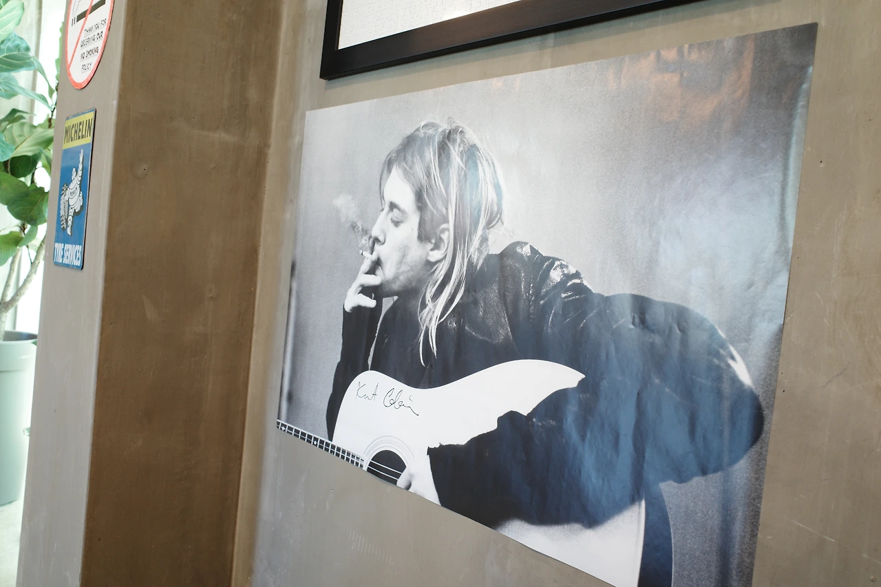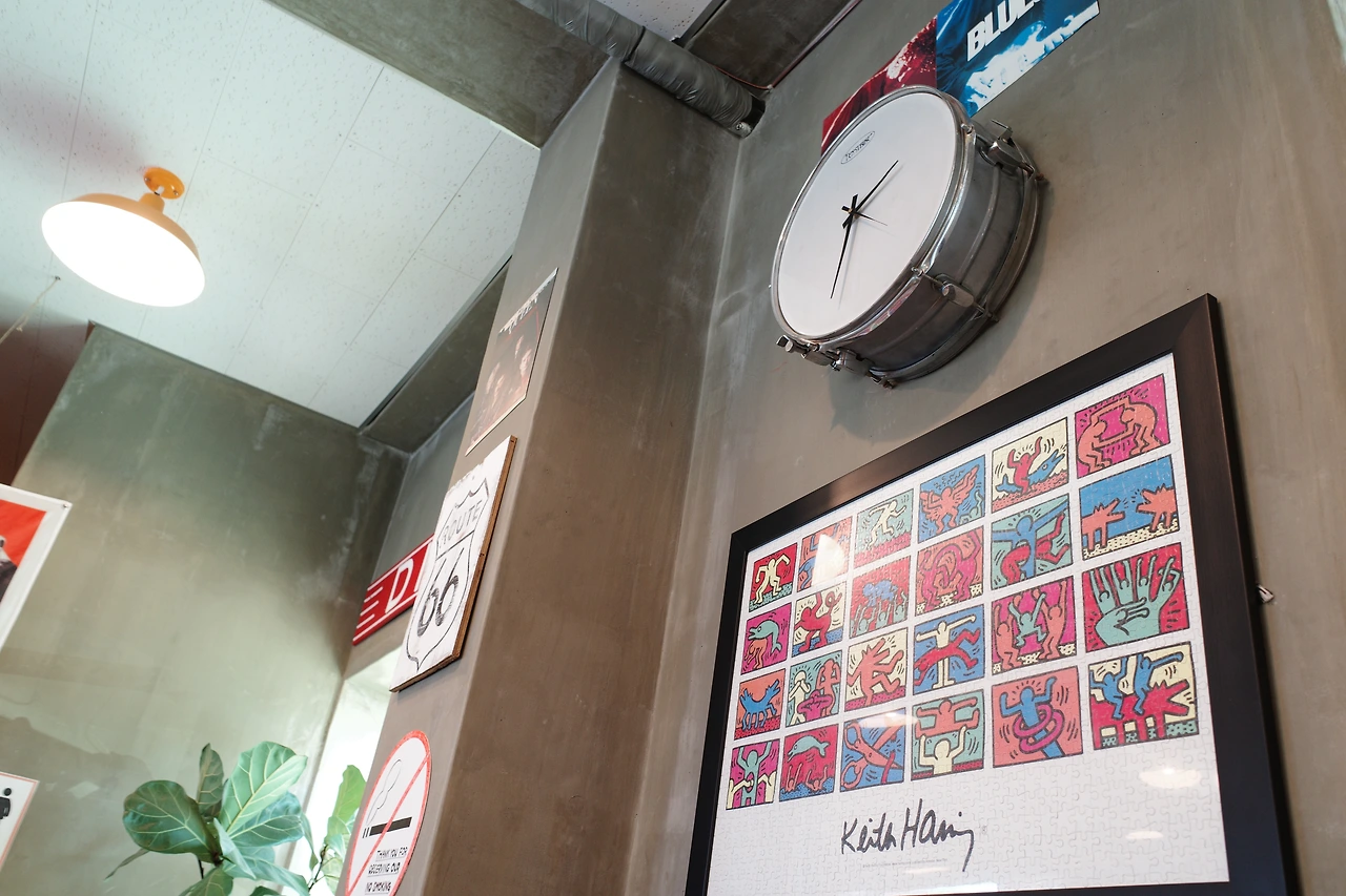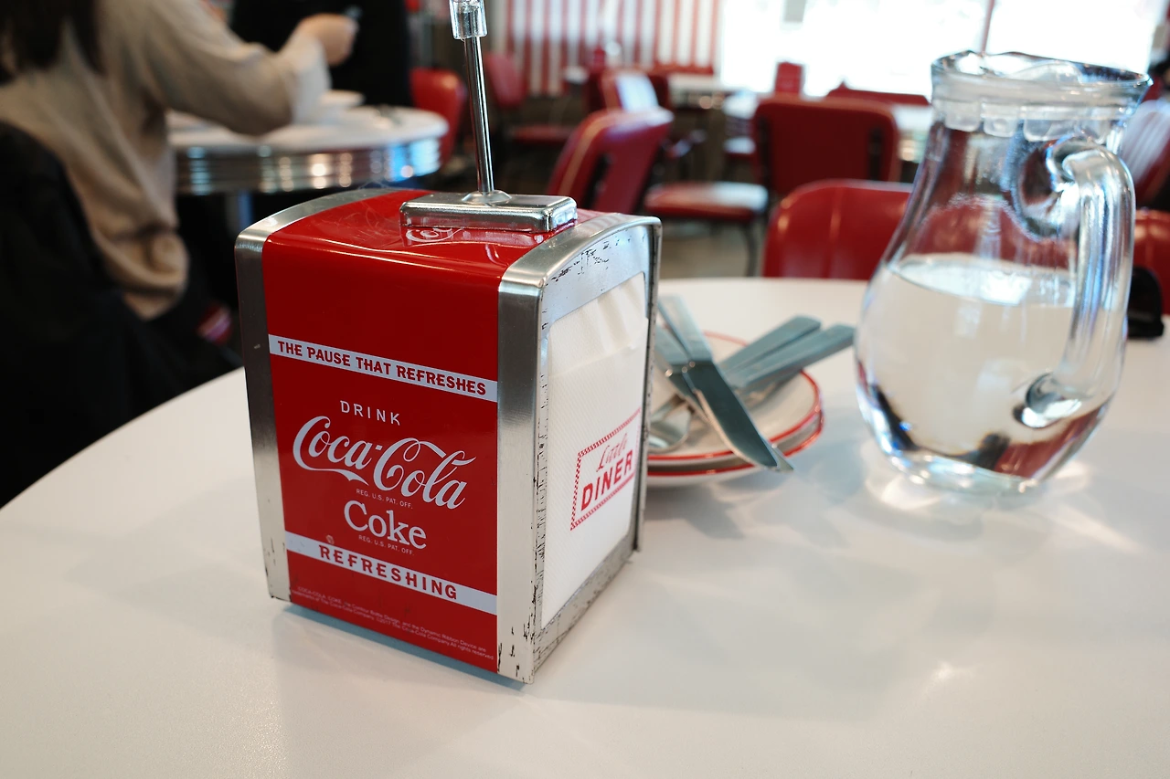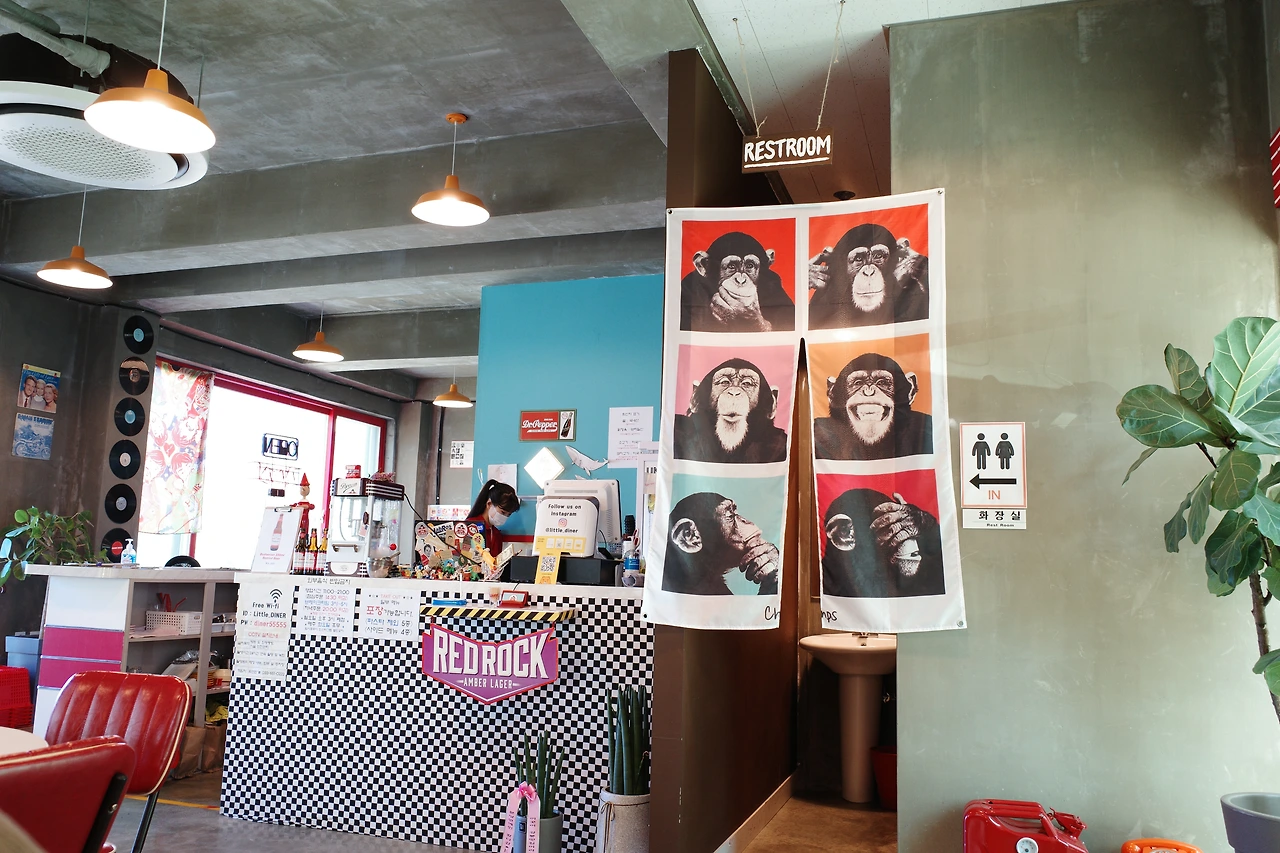3시부터 브레이크 타임이라 그때까지만 식사를 할 수 있었다. 자리에 앉자 마자 미리 생각해두었던 ‘오리지널 팬케이크 버거’와 ‘풀드포크 몬테크리스토’, 콜라 한 잔을 주문했다. 이곳에서 식사를 할 수 있다는 안도감으로 그제야 천천히 매장을 둘러보았다. 알록달록 색칠한 피아노, 일렉트로닉 기타, 우쿨렐레, ABBA를 비롯한 각종 LP와 함께 커트 코베인의 사진, 키스 해링의 그림 등으로 벽을 가득 채운 인테리어는 레트로와 키치함이 공존해 기분 좋은 시너지를 내고 있었다. 미국의 로드무비에서 종종 보았던, 교외나 국도변 등지에서 위치해 자동차 여행객들이 간단한 요기를 할 수 있는 식당을 다이너(Diner)라고 부르는데, ‘리틀 다이너’라는 이름답게 미국의 감성이 느껴지는 새빨간 인조 가죽 의자와 테이블이 구비되어 있었다. 여긴 분명 강릉인데 이곳에 앉아 있으니 잠깐 미국 여행을 하는 것 같았다. 4인 테이블이 5개 정도인 작은 가게이지만 테이블 간격이 넉넉해 공간이 좁게 느껴지진 않았다.