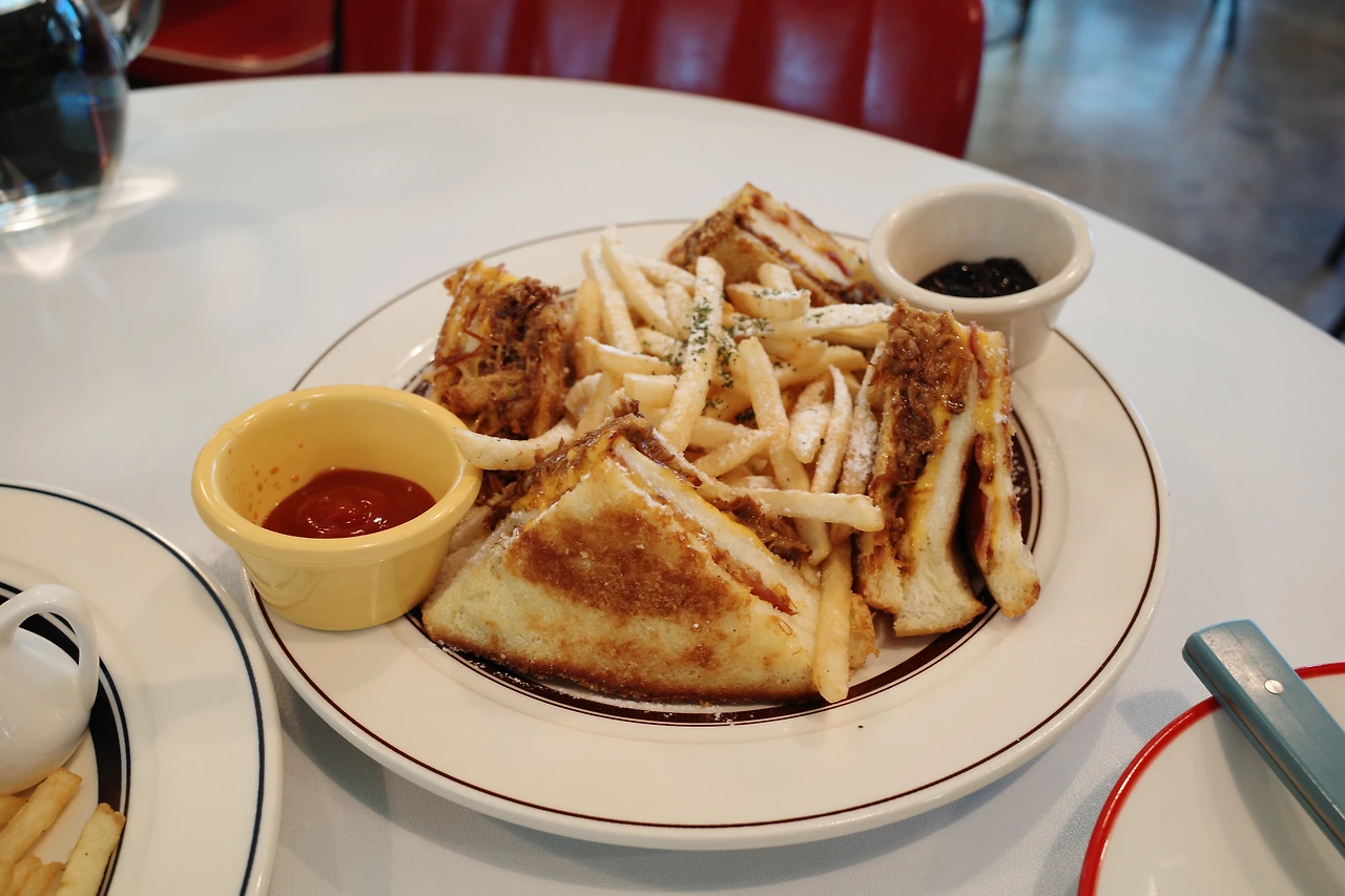 풀드포크 몬테크리스토도 굉장히 기대하던 메뉴였다. 샌드위치를 튀긴 몬테크리스토는 패밀리 레스토랑 베니건스가 있던 시절, 나의 ‘최애’ 음식 중 하나였다. 부드럽게 녹은 치즈와 터키 햄이 들어있고, 라즈베리 잼에 찍어 먹던 베니건스의 몬테 크리스토… 이곳의 몬테크리스토는 터키 햄 대신 돼지고기에 바베큐 소스를 발라 장시간 익히고 결대로 찢어낸 ‘풀드포크’를 넣어 만들었다. 베니건스의 몬테크리스토는 빵 겉에 튀김옷까지 입고 있지만, 이 음식은 식빵을 그대로 넣어 살짝 튀긴 듯 했고 더 담백했다. 짭짤한 풀드포크와 치즈, 빵, 슈가파우더까지. 게다가 튀기기까지 했기 때문에 맛이 없을 수 없는 음식이었다.(신발을 튀겨도 맛있을 거라고 하지 않나.) 블루베리 소스까지 곁들여 먹으니 베니건스의 몬테크리스토와 비슷하면서도 또 다른 맛을 즐길 수 있어 기분이 좋았다.