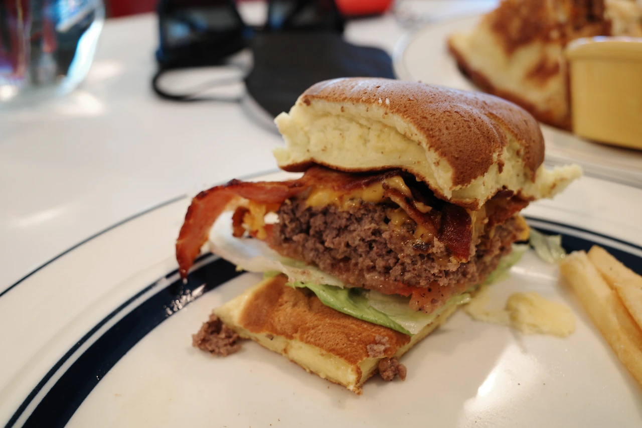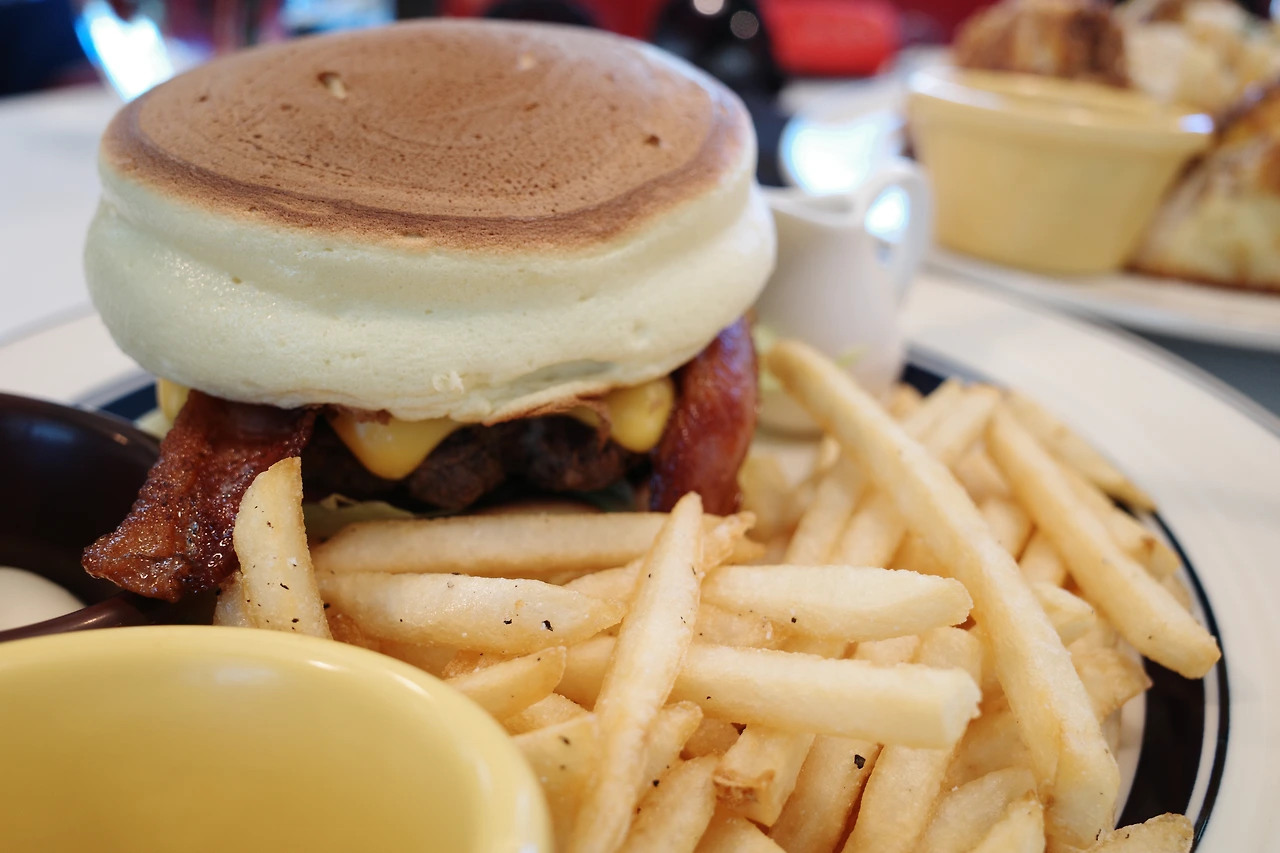모든 메뉴를 주문과 동시에 조리하기 때문에 시간이 좀 걸릴 거라는 안내문이 있었는데 늦은 점심시간이라 이미 식사를 하고 있던 한 테이블 외에는 우리밖에 없어서인지 음식이 나오는 데 15분이 채 걸리지 않았다. 매끈하게 익은 두툼한 팬케이크가 가장 먼저 눈길을 끌었다. 보기만 해도 폭신폭신해 보이는 수플레 팬케이크 아래로 베이컨이 귀엽게 혀를 내밀고, 치즈로 감싼 패티가 살짝 모습을 드러냈다. 깨끗하게 익은 감자튀김까지. 식기 전에 얼른 한입 베어 물고 싶어 빠르게 셔터를 눌렀다.