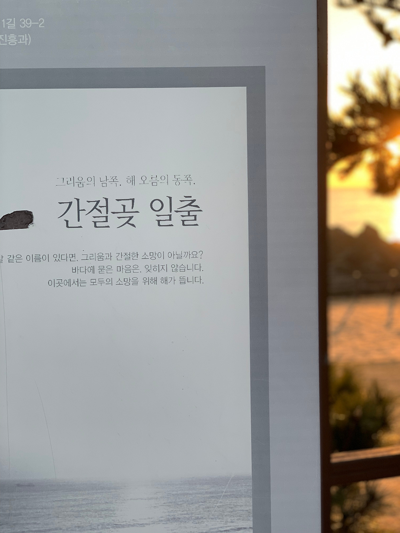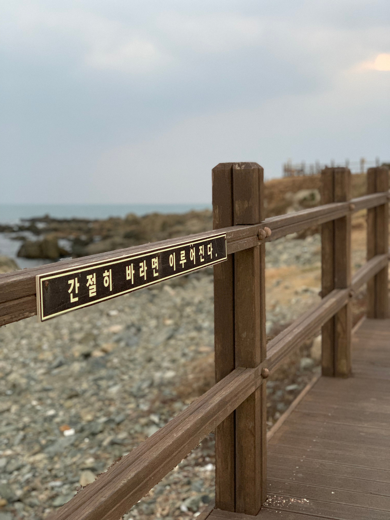 간절곶에 도착하니 오후 다섯 시가 지나고 있었다. 얼마 전 이곳도 새해 일출 맞이 인파로 미어터졌을 이곳은 지금 나 혼자뿐이다. 맑고 따뜻했던 포항과는 달리 간절곶은 흐리고 쌀쌀했다. 해안선을 따라 이어진 나무 데크길을 걸었다. 걸음을 옮길 때마다 펜스에는 잔잔한 문구가 붙어 있었다.
