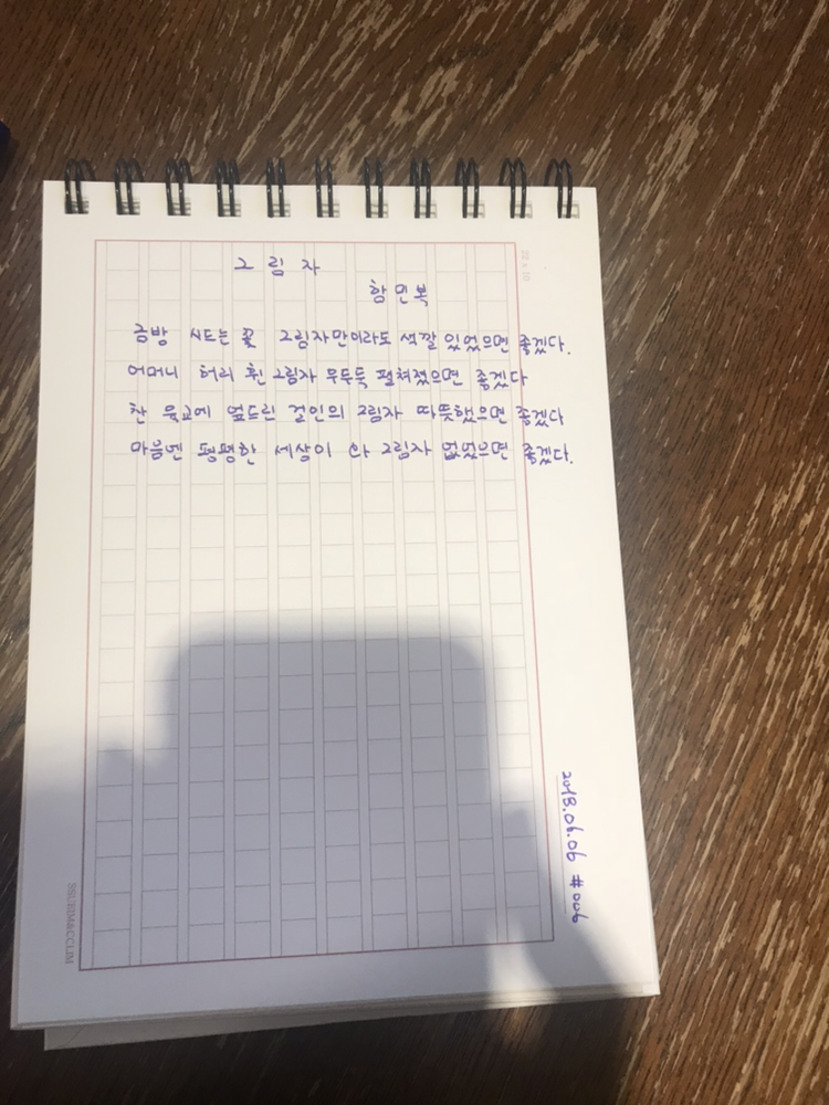 [0606] 006 그림자 by 함민복 금방 시드는 꽃 그림자만이라도 색깔 있었으면 좋겠다어머니 허리 휜 그림자 우두둑 펼쳐졌으면 좋겠다찬 육교에 엎드린 걸인의 그림자 따뜻했으면 좋겠다마음엔 평평한 세상이 와 그림자 없었으면 좋겠다