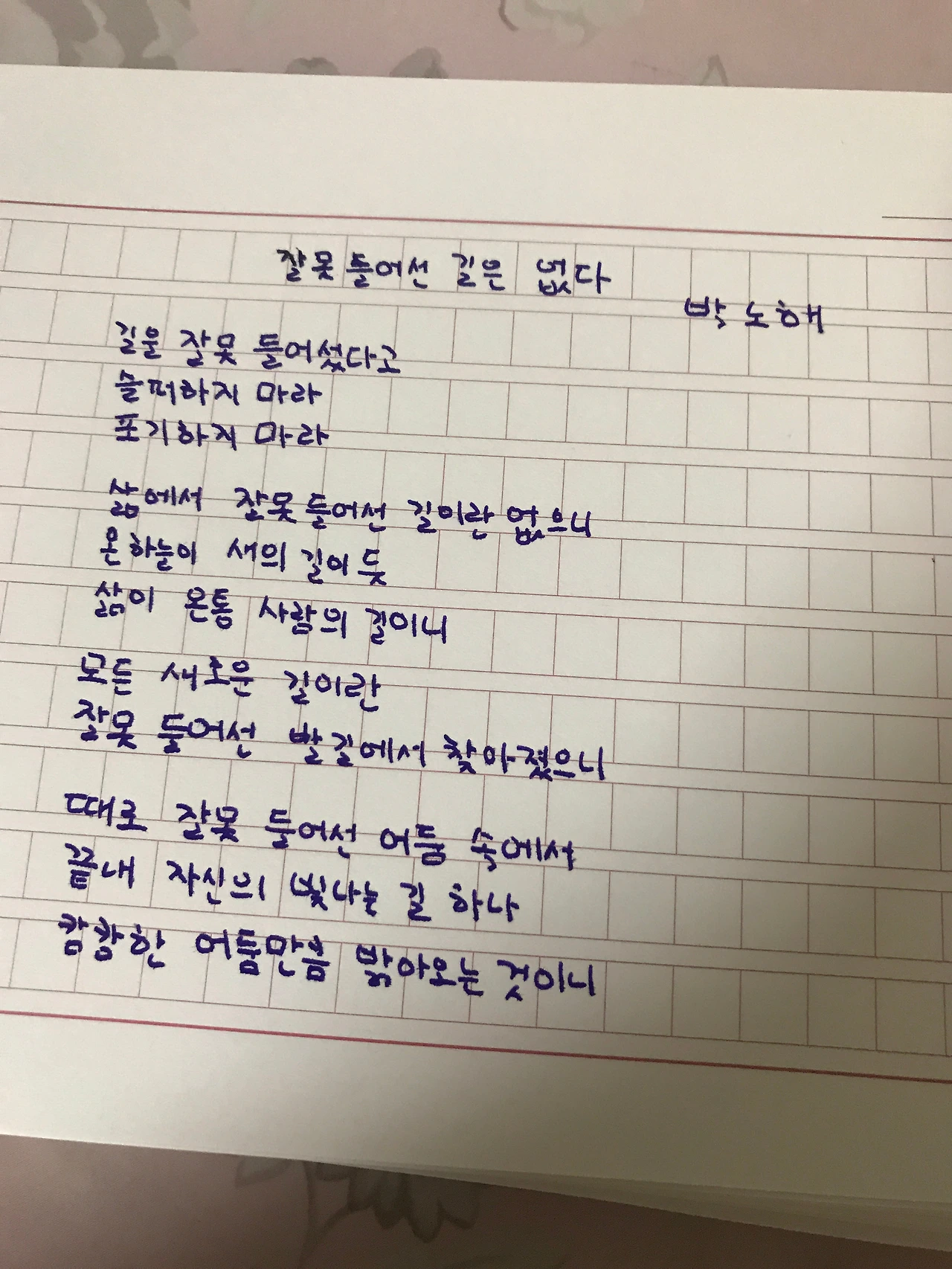 [0705] 035_잘못 들어선 길은 없다 by 박노해길을 잘못 들어섰다고 슬퍼하지 마라포기하지 마라 삶에서 잘못 들어선 길이란 없으니 온 하늘이 새의 길이 듯 삶이 온통 사람의 길이니 모든 새로운 길이란 잘못 들어선 발길에서 찾아졌으니 때로 잘못 들어선 어둠 속에서 끝내 자신의 빛나는 길 하나 캄캄한 어둠만큼 밝아오는 것이니