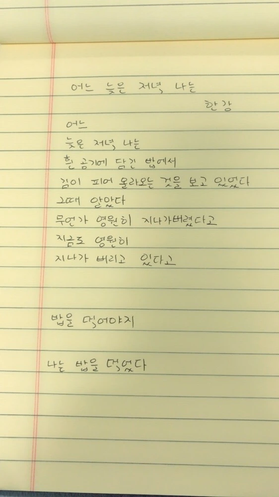 [0709] #039 어느 늦은 저녁 나는 / 한강어느늦은 저녁 나는흰 공기에 담긴 밥에서김이 피어 올라오는 것을 보고 있었다그때 알았다무언가 영원히 지나가버렸다고지금도 영원히지나가 버리고 있다고밥을 먹어야지나는 밥을 먹었다