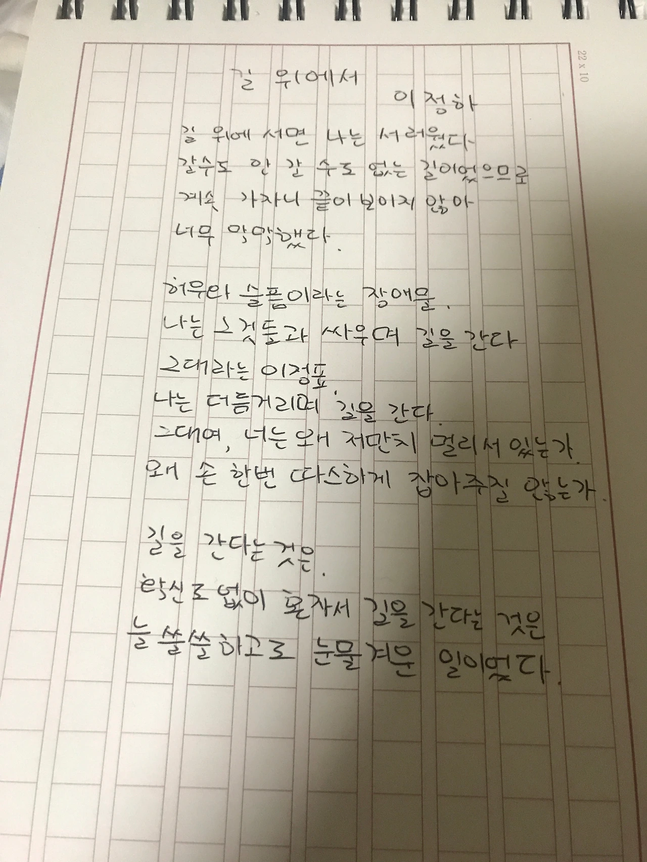 [0819] #80 길 위에서 - 이정하길 위에 서면 나는 서러웠다.갈 수도, 안 갈 수도 없는 길이었으므로,계속 가자니 끝이 보이지 않아너무 막막했다.허무와 슬픔이라는 장애물,나는 그것들과 싸우며 길을 간다.그대라는 이정표,나는 더듬거리며 길을 간다.그대여, 너는 왜 저만치 멀리 서 있는가.왜 손 한 번 따스하게 잡아주질 않는가.길을 간다는 것은,확신도 없이 혼자서 길을 간다는 것은늘 쓸쓸하고도 눈물겨운 일이었다.