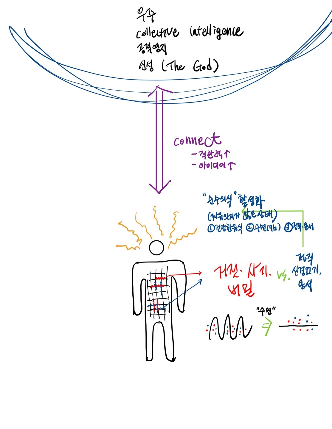 관리적 측면에서 우리 몸에 있는 무수한 신경망을 깨끗하게 관리해야 합니다. 그러면 우주 또는 신성(The God)이라 불리는 에너지장에 연결되게 되고 직관력이 놓아지고 아이디어가 쏟아나게 됩니다. 방법으로는 먹는 것이 나라는 말이 있듯이 몸에 좋은 음식을 섭취해야 합니다. 두 번째로 하루 7시간 이상의 수면을 취해야 합니다. 바쁜 현대를 살아가고 있는 사람들은 충분한 수면량을 확보하기가 어렵습니다. 그러나 수면은 우리가 낮에 받았던 스트레스나 안 좋을 일들로 인해 얽히고 꼬여있는 신경망을 건강한 상태인 평평한 상태로 돌리는 기능을 합니다. 세 번째로는 신경 끄기 기술을 시전해야겠습니다. 정직하게 살면서 미움, 시기, 거짓 등 우리 신경망을 교란시키는 안 좋은 것들로부터 멀리하고 혹시나 생긴 특정상대에 대한 미움은 용서함으로써 마음의 평정을 찾도록 하여야겠습니다. 나의 주의 입자를 활성화시켜서 좋은 에너지를 가지고 있으면 우리는 다른 좋은 에너지, 즉 주의입자를 불러오게 된다. 모든 것은 Attention(무의식 속)을 관리하고 활용하는 게임입니다. 이것은 우리의 삶의 질을 달라지게 만들 것입니다.