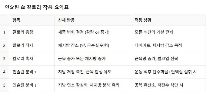 칼로리는 연료의 양을 결정하고, 인슐린은 그 연료를 어디에 저장할지를 결정한다. 이 두 가지를 정확히 이해하면, 어떤 식단을 선택하든 방향을 잃지 않는다. 인슐린은 결코 단순한 ‘살찌게 하는 호르몬’이 아니다. 때로는 근육을 회복시키고 성장시키는 조력자가 되며, 때로는 체지방을 효율적으로 저장시키는 경로를 열기도 한다. 중요한 건 그 리듬을 읽고, 타이밍을 맞추는 것이다. 공복 유산소와 저탄수 식단은 체지방을 줄이는 데 효과적이고, 운동 직후의 단백질+탄수화물 조합은 근육 합성에 결정적인 작용을 한다.