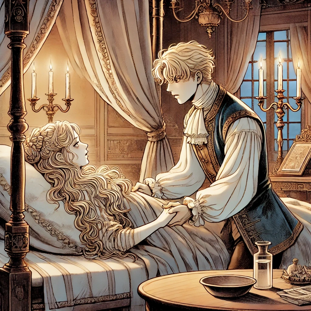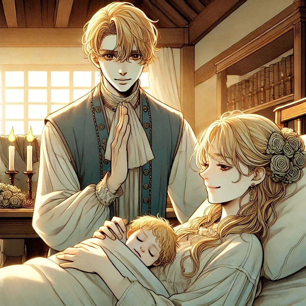 아라미스는 산고의 고통으로 정신이 흐릿한 상태였다. 리오날은 그녀의 손을 꼭 잡고 낮은 목소리로 속삭였다.