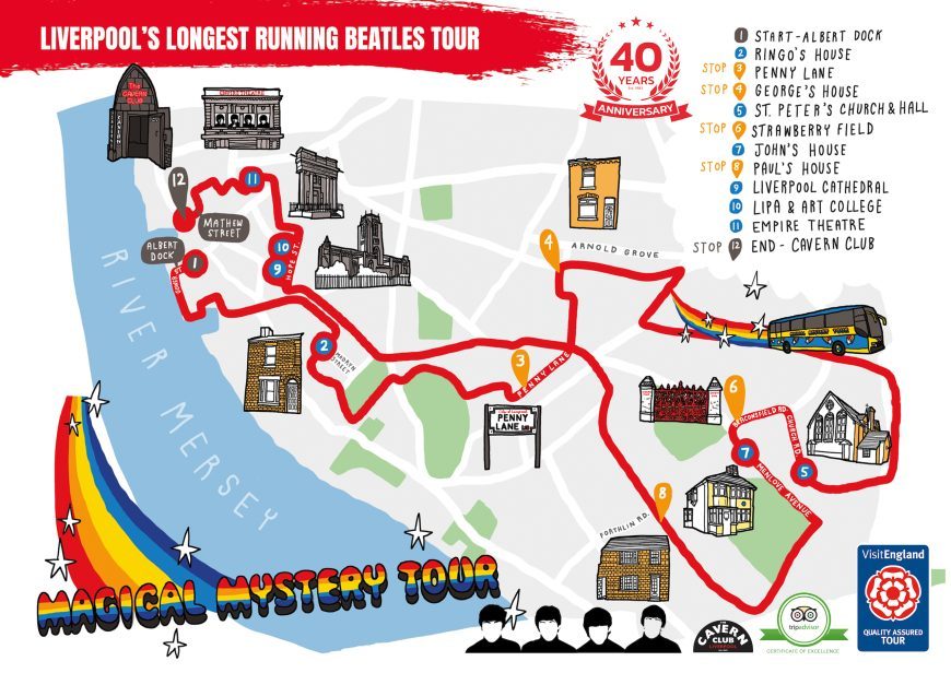 한국어로 '비틀즈 마법의 미스터리 투어'라고 한화로 약 30,000원 정도 하는 2시간짜리 가이 버스 투어이다. Beatles 멤버들이 고향인 리버풀에서 그들의 어린 시절에 살던 집, 학교, 기념이 되는 장소 그리고 앨범에 나오는 유명한 'Penny Lane'과 'Strawberry Field'를 갈 수 있다고 한다.