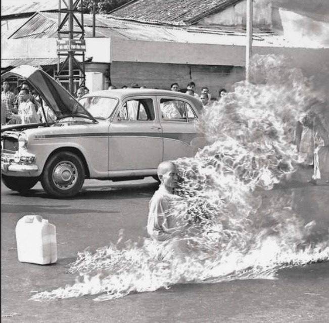 남베트남 정권이 종교 탄압을 이유로 사원을 불지르고 국민의 대부분을 차지하는 불교 신자들을 탄압하였다. 스님은 종교의 탄압에 저항하고 자유를 위해 분신을 선택한 것이다. 주변 동료 승려의 도움을 받아 휘발유를 붓고 소신공양을 하였다. 스님은 아무 미동도 없이 자신의 몸을 태우며 조용히 죽음을 맞이하였다.