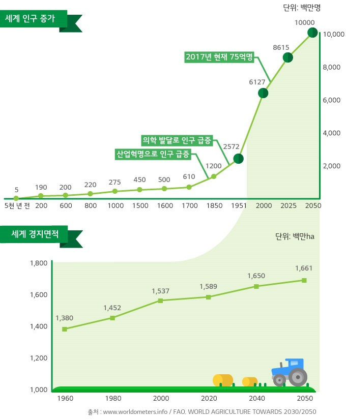 빌 게이츠의 말처럼 세계 인구가 증가하는 것에 비해 경지면적의 증가가 그를 따라잡지 못하는 문제에 직면해 있다. 한정된 경지면적 내에서 높은 생산성을 만들어내야 하는 상황인 것이다.