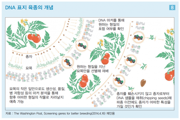 바이오 기술의 발전에 힘입어 육종 방식에도 혁신이 일어나고 있다. 초고속 DNA 염기서열분석기가 등장하고 DNA 표지 확인을 통해 약 1년에서 최대 5년까지 걸리는 수확시기를 기다리지 않고 확인할 수 있게 되었기 때문이다. 실제로 원하는 색, 맛, 단단함 등의 형질이 나타났는지 물리적으로 확인하는 ‘Wait and See’ 기간을 최소화 할 수 있게 되면서 새로운 품종 개발에까지 걸리는 시간이 급속히 줄어들고 있다. DNA 표지 육종(DNA marker-assisted breeding) 방식이라고 하는 첨단의 육종 기술로 벼의 경우 기존에 약 10년이 걸리던 육종기간을 3~5년 단축할 수 있다. DNA 표지 육종 방식에서는 묘목의 작은 잎만으로도 생산성, 품질, 병 저항성 등의 표지 분석을 통해 향후 어떠한 형질의 작물로 자라날지 예측할 수 있다.