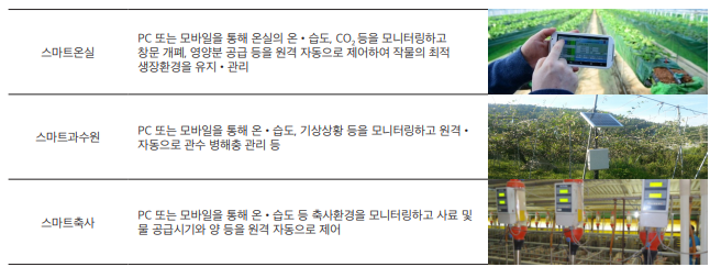 현재는 SW로 온습도. 일사량 조절과 양분 자동 공급 및 창문 개폐하는 수준이지만 향후에는 재배 패턴을 분석해 유사한 작물에 대해 우수한 패턴을 제시하여 재배환경을 자동으로 관리하거나 로봇이 자동으로 작물의 병충해관리와 생육을 담당하여 노령화로 인한 노동력 축소에도 불구하고 생산성을 유지하거나 높일 수 있을 것으로 기대된다.
