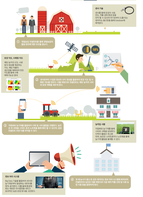 정밀농업을 하기 위해서는 센서기술, ICT기술, 정보관리, 화공 등의 다양한 기술들이 융복합되어야 한다.