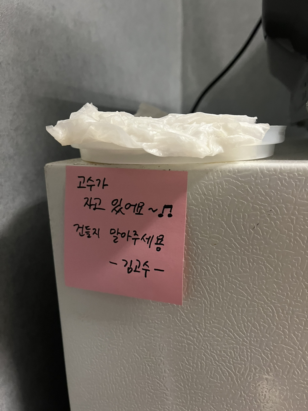 과장님과 상의하여 위치를 옮기기로 했다. 그곳은 바로 탕비실에 있는 냉장고 위. 에어컨 바람이 닿지 않으면서도 은은한 냉장고의 온기가 타고 올라와 따뜻할 것 같았다. 다만 다소 괴랄(?)한 비주얼에 쓰레기인 줄 알고 누군가가 버릴까 걱정됐다. 그래서 이름까지 지어서 포스트잇을 붙여놨다.
