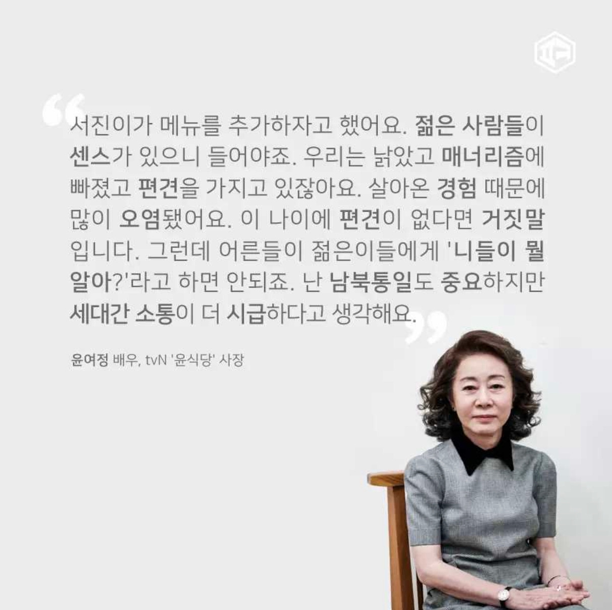 나이가 들어간다고 성숙함이 자동완성 기능으로 생성되는 건 아니다. 부단한 노력과 트렌드에 대한 이해심과 공부(세상 물정), 배려심이 함께하는 사람에게서는 성숙함이라는 유연한 생각과 행동이 따라온다. 오히려 훨씬 어린 연령대의 사람들과 의견의 대립이 아닌 공유와 소통을 하는 그 모습에서 윗세대로서 어떻게 살아가야 할지 방향이 보인다.