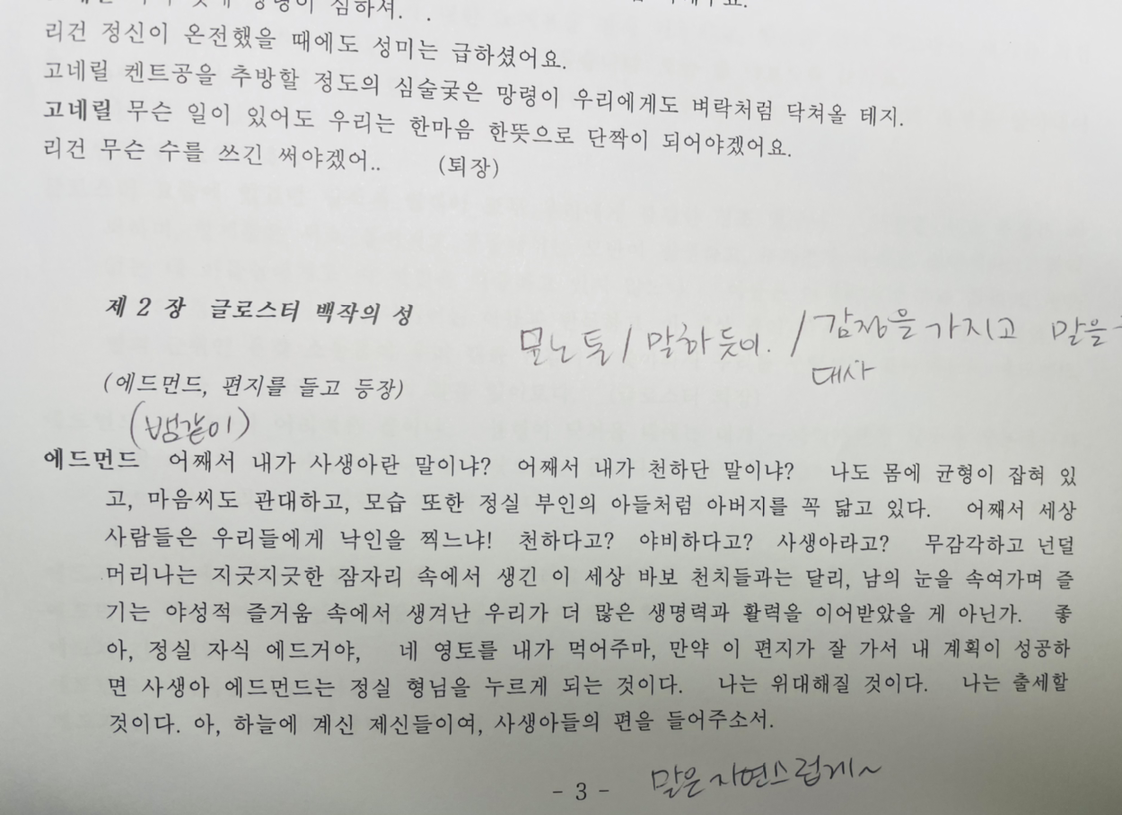 내가 베꼈던 대본의 남자분은 '에드먼드'역할이었고 매력적으로 위에 대사를 소화했다. 잘은 모르지만 나와 같은 취미 생활이 아닌 뭔가 제대로 배움을 시작하는 사람 같았다. 배우려는 진지한 태도, 눈빛 연기, 집중력은 연기를 모르는 내 눈에도 보였다.