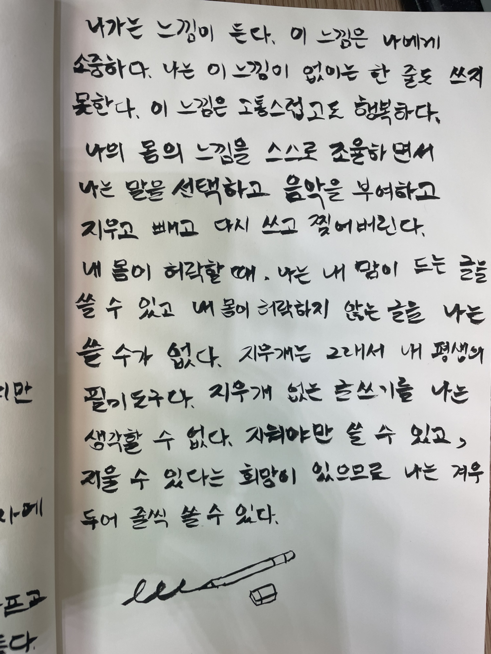 붓펜으로 천천히 쓰는 글씨는 저자의 글을 천천히 읊조리게 되는 기회가 된다. 평소처럼 휘리릭 읽어내리지 않고 눈으로 한 번 읽고, 손으로 한 번 쓰는 지루하고 단순한 동작은 의외로 마음을 진정시켰다.
