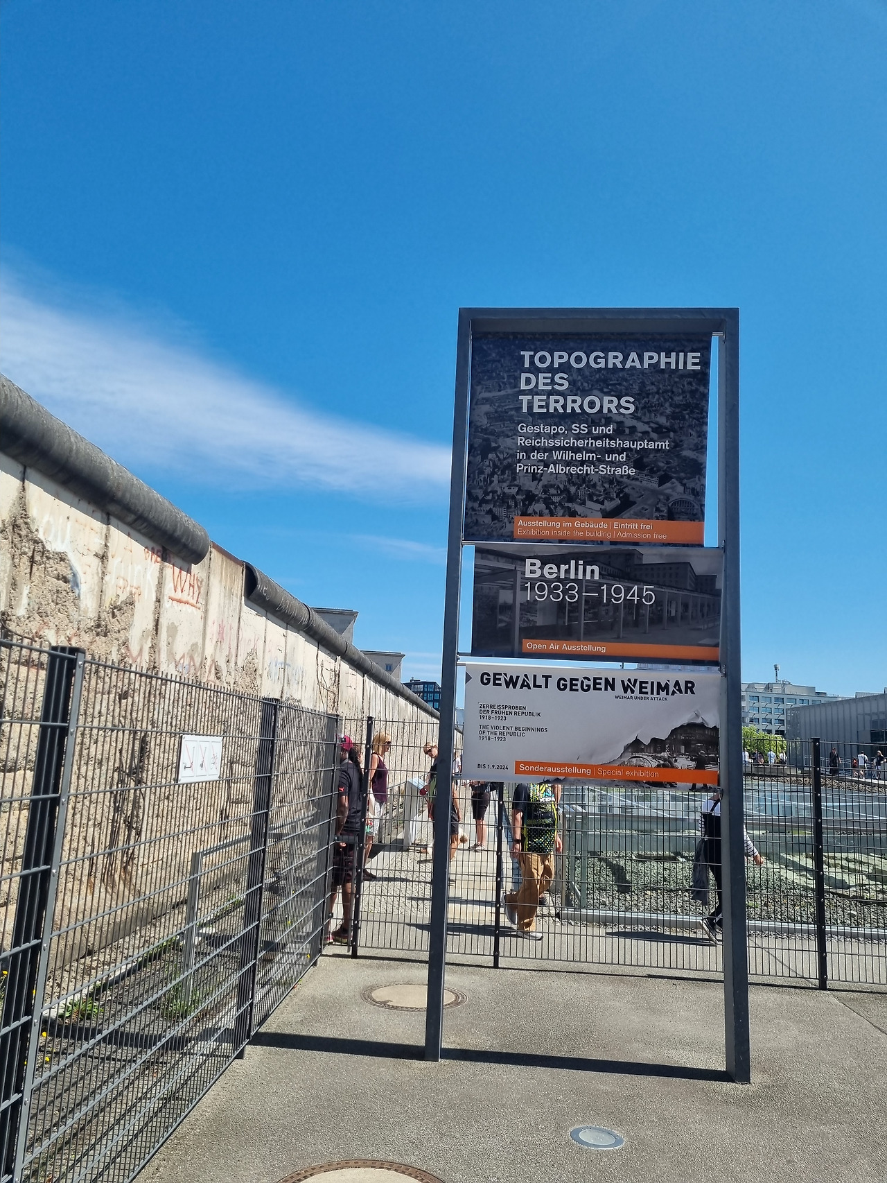 카페를 나와 베를린 장벽을 볼 수 있는 공포의 지형학(Topographie des Terrors)이라는 곳으로 갔다. 이곳은 베를린장벽이 세워지기 이전 독일 나치 시대 대부분의 범죄를 계획하고 지도하는 중심 역할을 했던 곳이다. 특히 온갖 테러를 처리하기 위한 비밀경찰(Gestapo)의 본부이자 독일 제국 총독부가 있던 곳으로 유명하다. 전쟁 시 파괴된 흔적이 남아 있고 나치 시절 프로파간다와 테러에 대한 자료들을 보여주는 전시장도 둘러볼 수 있다. 전시관 앞에 사람들이 많이 줄 서 있어 내부는 들어가지 않고 야외에 전시되어 있는 사진만 둘러보았다.