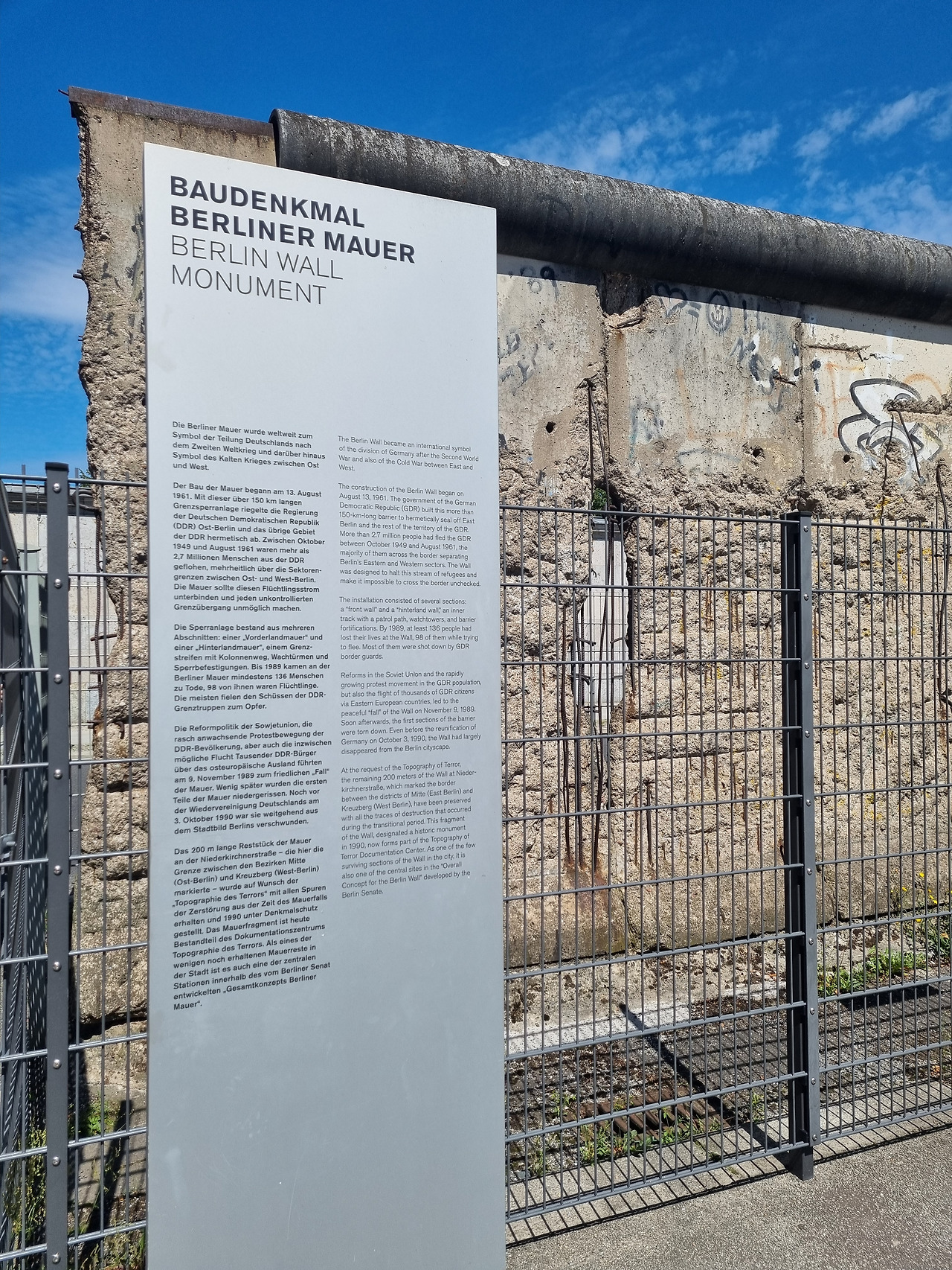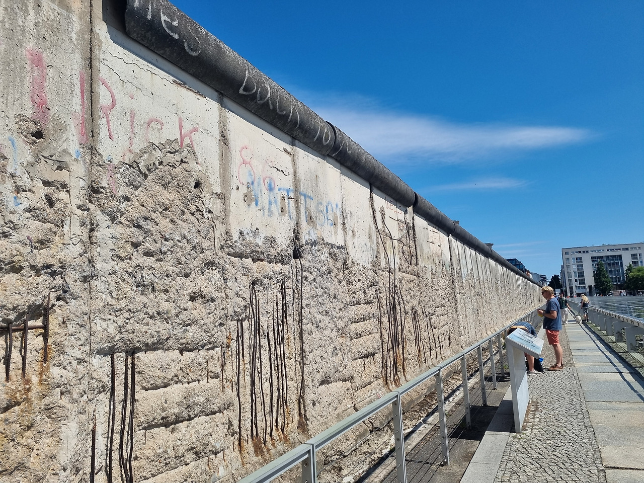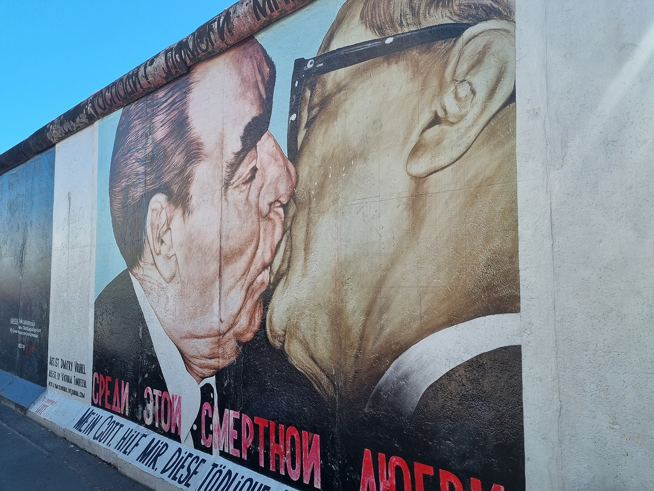 이스트 사이드 갤러리는 베를린 장벽의 동쪽 일부에 조성된 미술 갤러리이다. 1990년 세계 각국의 미술 작가들이 그린 100여 점의 벽화로 구성되어 있다. 1.3km를 다 돌아볼 수는 없고 가장 유명한 작품, 드리트리 브루벨이 그린 '형제의 키스'를 보는 것을 목표로 하였다. 1979년 동독을 방문한 소련의 서기장 브레즈네프와 동독의 서기장 호네커가 공식 석상에서 실제 키스를 한 사진을 그대로 그림으로 옮겨놓은 것이다. 1986년 소련 공산당 서기장 고르바초프도 동독을 방문하여 호네커와 축하 입맞춤을 하였는데, 이를 재현한 것이라고 한다. 1989년 10월 7일 동독 건국 40주년 기념일에 호네커는 열병식에서 베를린 장벽이 100년은 갈 것이라 호언장담하였는데, 22일 뒤 장벽이 무너졌다고 한다.