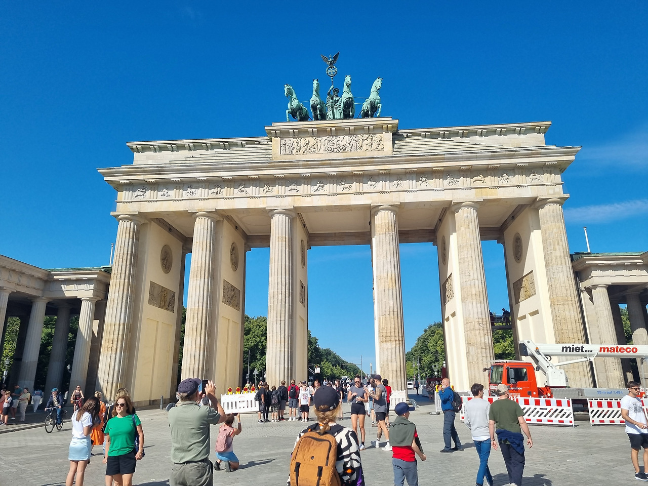 남쪽으로 조금만 걸어가면 브란덴부르크문이 있다. 꽃보다 할배 팀들이 베를린 갔을 때 맨 처음 갔던 곳으로 베를린을 대표하는 신고전주의 양식의 건축물이다. 18세기 후반 프리드리히 빌헬름 2세의 명령에 따라 지어졌으며, 1788년에 착공되어 1791년에 완공되었다. 냉전시대에는 동서 베를린을 나누는 베를린 장벽이 이 문을 둘러싸고 있어 분단의 아이콘이었으며 1989년 베를린 장벽이 무너진 후에는 통일의 상징이 되었다. 높이 26미터, 폭 65.5미터로, 12개의 도리아식 기둥이 5개의 통로를 형성한다. 문 위에는 ‘쿼드리가’라고 불리는 승리의 여신 빅토리아가 네 마리 말이 이끄는 전차를 타고 있는 조각상이 있다. 이 조각상은 평화를 상징하며 브란덴부르크문의 아이콘으로 자리 잡고 있다. (아무래도 독일의 지배자들은 프랑스의 개선문 같은 상징적인 건축물을 원했던 모양이다.)