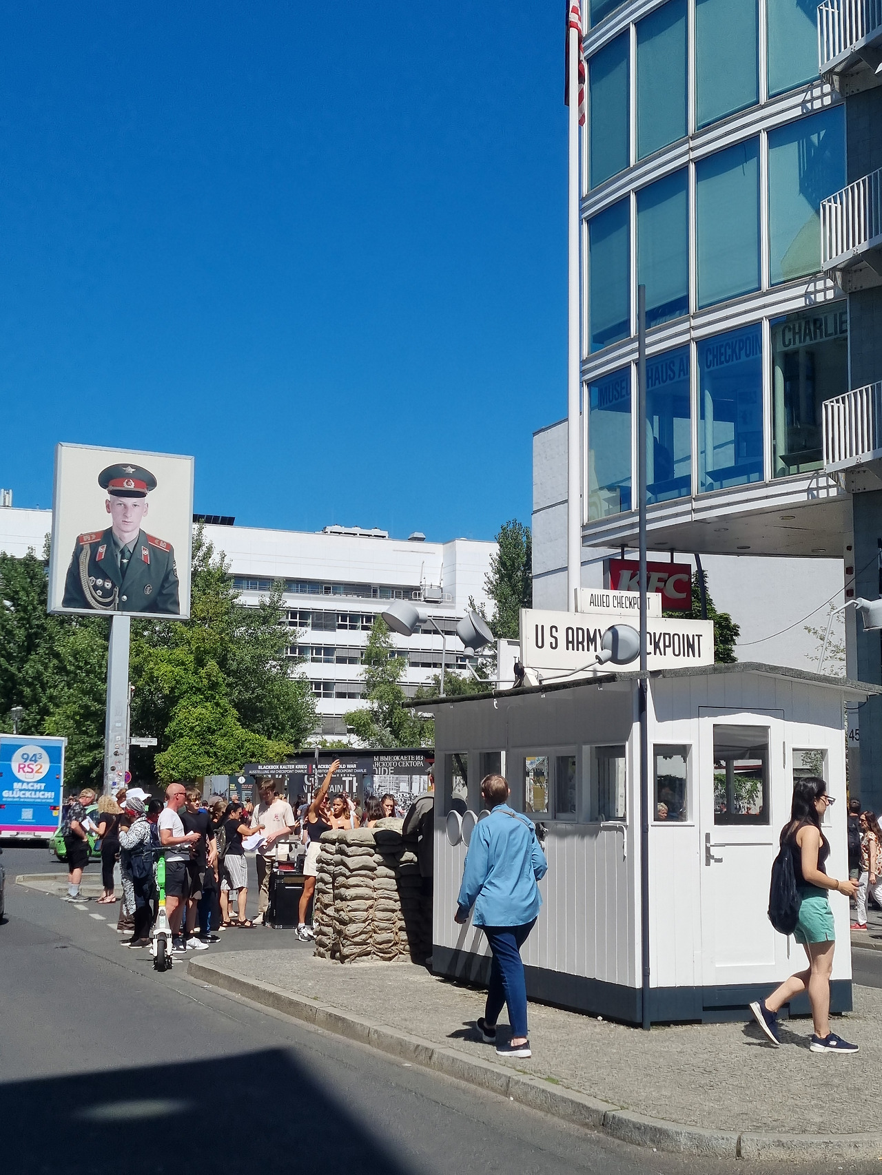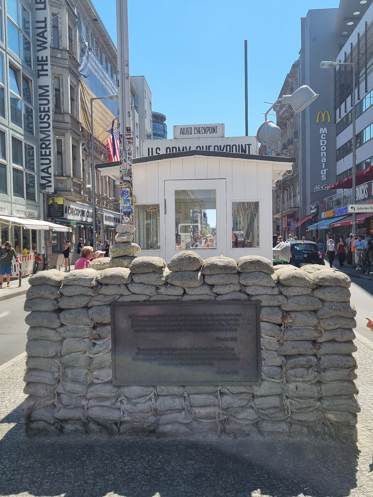 체크포인트 찰리는 베를린장벽이 생긴 이후에도 동서독인들이 출입을 했던 곳으로 주로 군인들이나 외국인, 연합국 측 인사들이 지나다니는 주요 통로였다. 살벌했던 분단과 냉전을 상징하는 작은 검문소에는 두 사람이 기념사진을 찍어주고 있었다. 이 사진은 뭔가 작업을 하고 나면 그 시절 신문같이 편집되어 A4용지에 출력해 준다. 우리도 줄을 서서 사진을 찍었다. 베를린시와 체크포인트 찰리를 홍보하는 글과 함께 우리의 모습이 담긴 신문인데, 우리에게 좋은 기념품이 되었다. 감사의 마음으로 기부금 상자에 약간의 기부금을 넣었다. 근처에는 장벽을 넘고자 했던 이들의 사연과 기록들이 있는 전시관이나 당시 상황을 보여주는 사진들이 거리에 전시되어 있어 늘 관광객들의 발길이 끊이지 않는다.