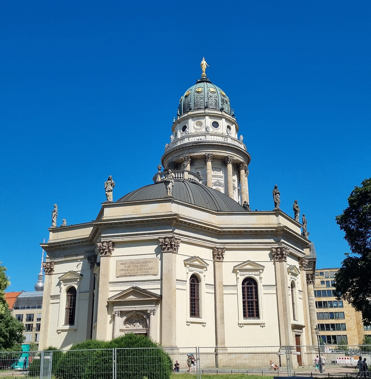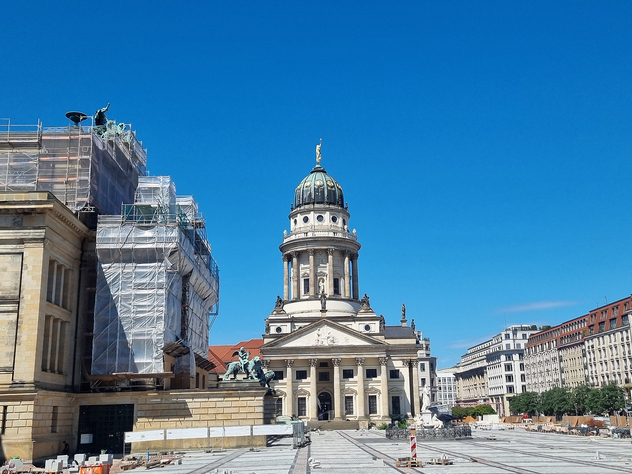 다음 일정은 잔다르멘 마르크트 광장으로 베를린에서 가장 아름다운 광장으로 불린다. 콘체르트하우스 베를린을 중심으로 북쪽에 프랑스돔, 남쪽에 독일돔이 있다. 주변 지역은 예전부터 프랑스인이 많이 살았다고 한다. 콘체르트하우스와 광장은 공사 중이어서 그런지 가장 아름다운지는 잘 모르겠다.