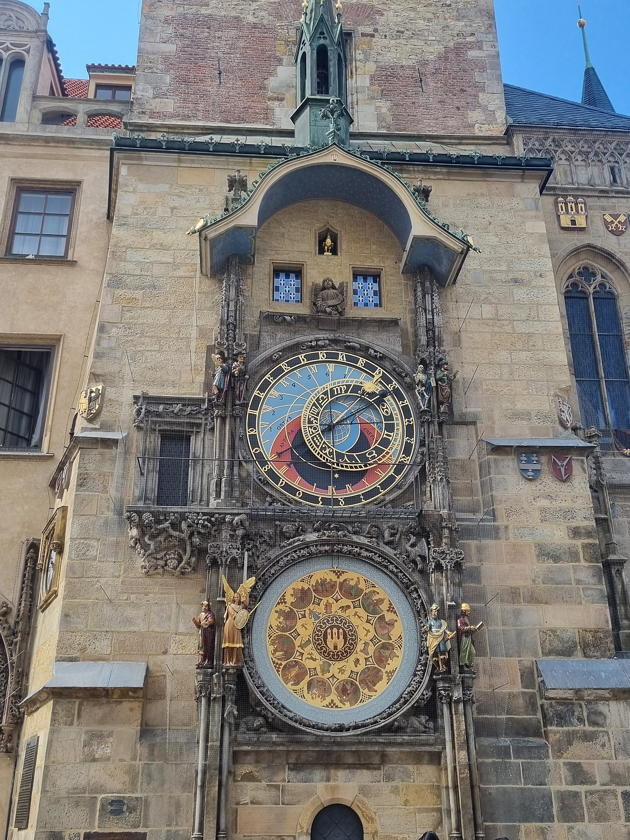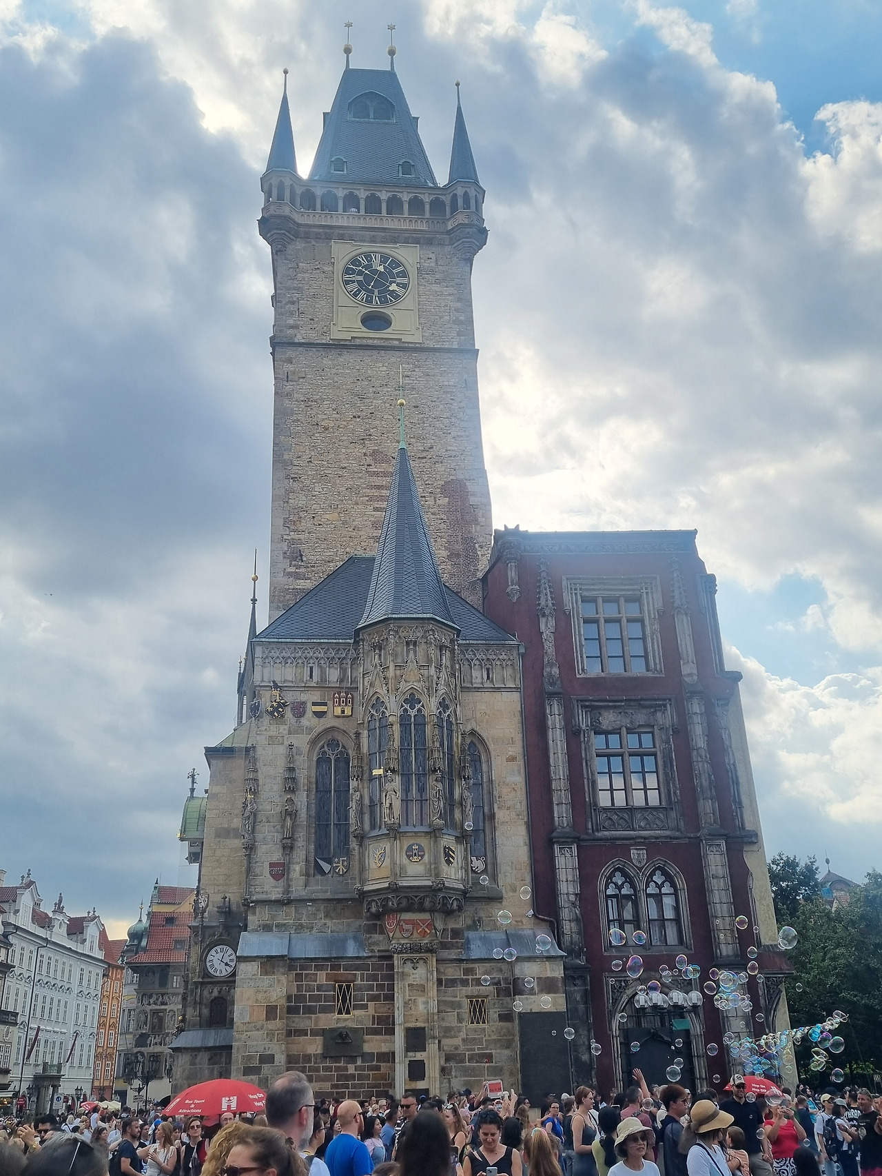 틴 성당 가기 전에 옛 시청사 건물에 시계탑이 있다. 이 시계탑에 올라가서 프라하 시내를 전망하기도 한다 하지만 대부분의 관광객들은 탑 전면에 있는 천문시계를 보러 온다. 마침 시계가 움직일 시간이 되어 가니 사람들이 구름같이 몰렸다. 시계 장치는 세 개의 부분으로 구성되어 있다. 첫 번째는 천문 눈금판으로, 해와 달의 위치와 다양한 천문 정보들을 표시한다. 두 번째는 '사도들의 행진'으로, 매 시간마다 해골이 줄을 당기고, 모래시계가 뒤집히고, 예수의 열두 제자가 지나가고, 닭이 우는 등 여러 움직이는 조각품들이 나타난다. 세 번째는 달력 눈금판이다. 특별할 것도 없는데, 특별하다. 이 1분 남짓 시간 동안 다른 많은 사람들처럼 고개를 치켜들고 사진을 찍으며 구경했다. 혹시나 소매치기가 있을까 가방은 앞으로 매고.
