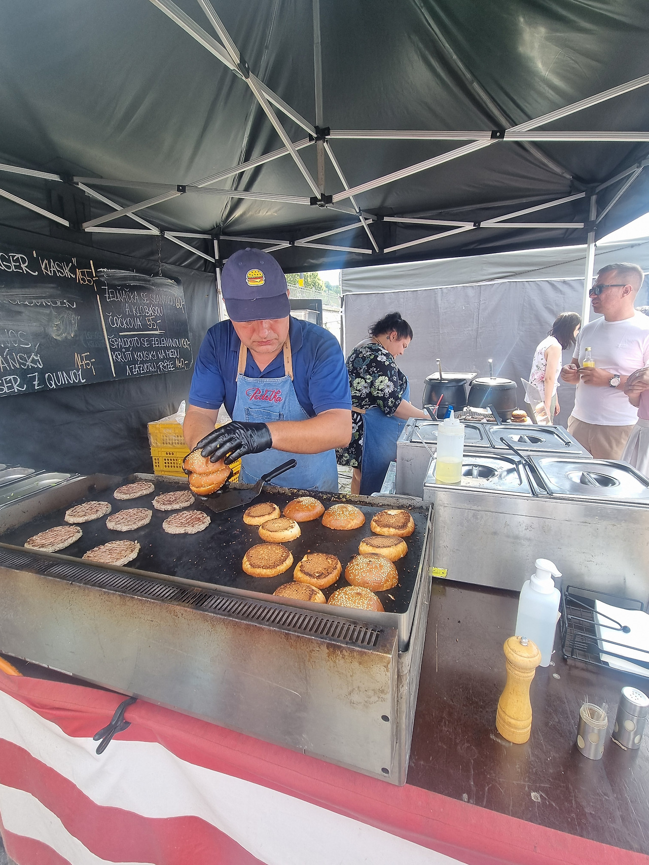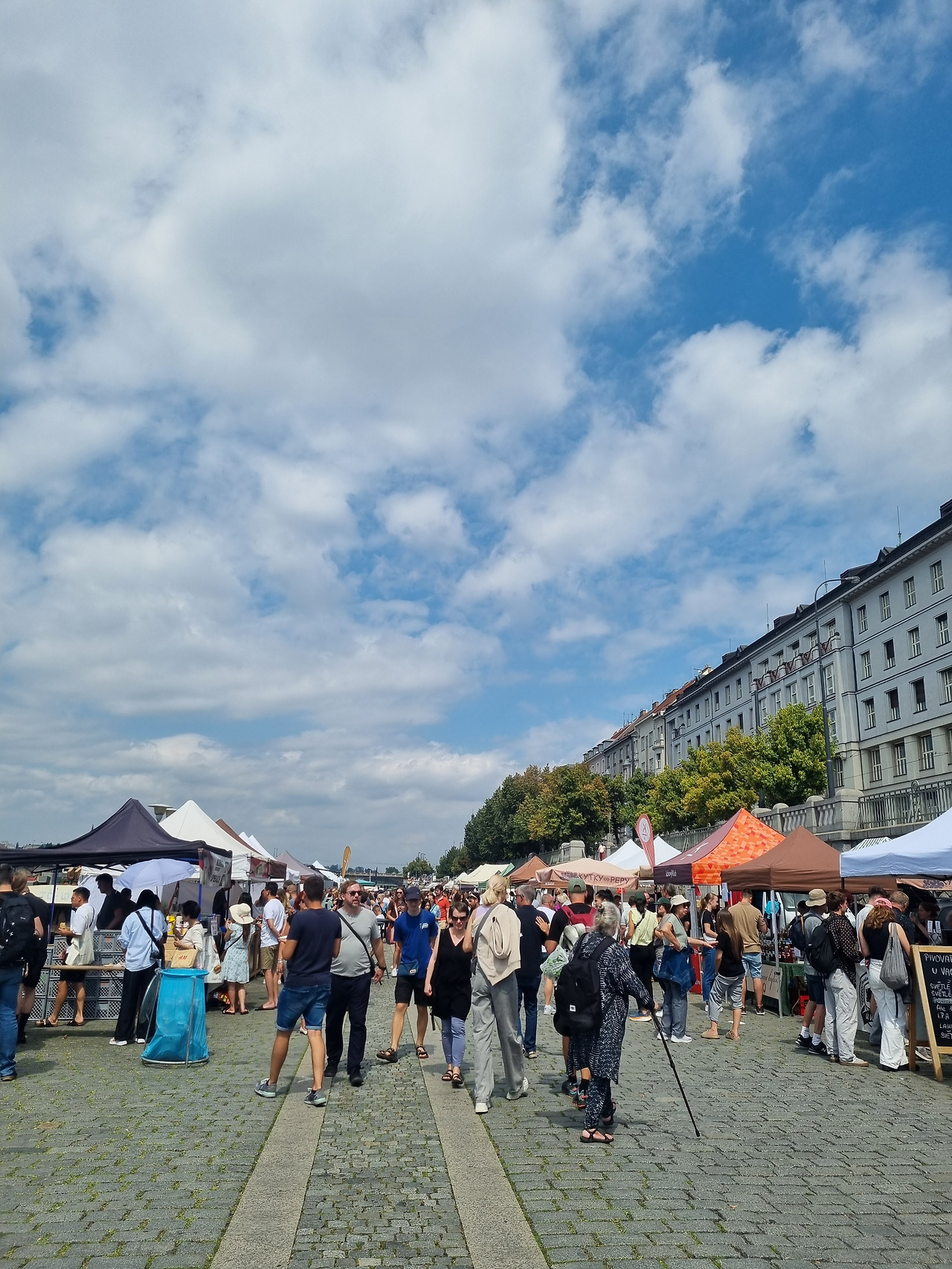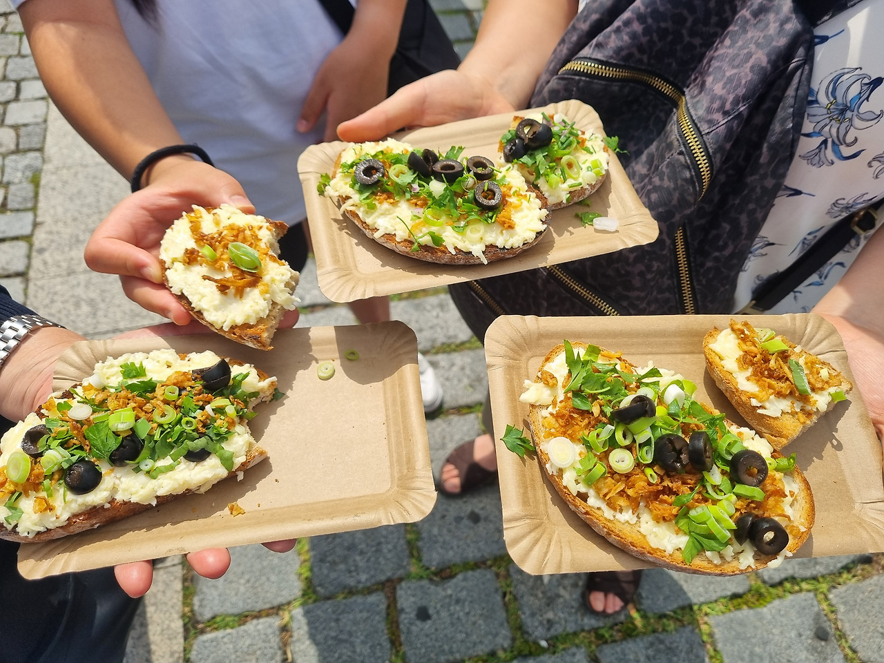 프라하에는 신선한 제철과일과 채소, 치즈, 빵, 수공예품 등을 파는 파머스 마켓이 몇 개가 있는 모양이다. 우리는 간 곳은 프라하를 가로지르는 블타바강변에 매주 토요일에만 열리는 마켓이다. 지현언니가 여행계획을 세울 때 남편이 적극 추천한 곳이라 한다. 우리가 도착한 날이 마침 토요일이라 가보기로 하였다. 규모는 크지 않은데, 사람들이 엄청 많았다. 특히 다양한 현지 먹거리가 많아 여기에서 점심을 해결하기로 했다. 먼저 줄 서서 먹는 바질토스트를 맛보았다. 바게트 빵 위에 치즈와 튀긴 마늘, 파와 올리브를 토핑으로 올려 먹는다. 이거 하나만 먹어도 배가 부른데, 윤지와 지현언니는 닭꼬치와 닭다리 튀김을 먹은 후 수제햄버거도 하나씩 먹었다. 물론 나도 한 입씩 맛보긴 했다. 수제햄버거집도 번호표를 받을 정도로 사람들이 많았다. 가격은 저렴한데 엄청 맛있었다. 그늘이 없어 좀 힘들긴 했지만.