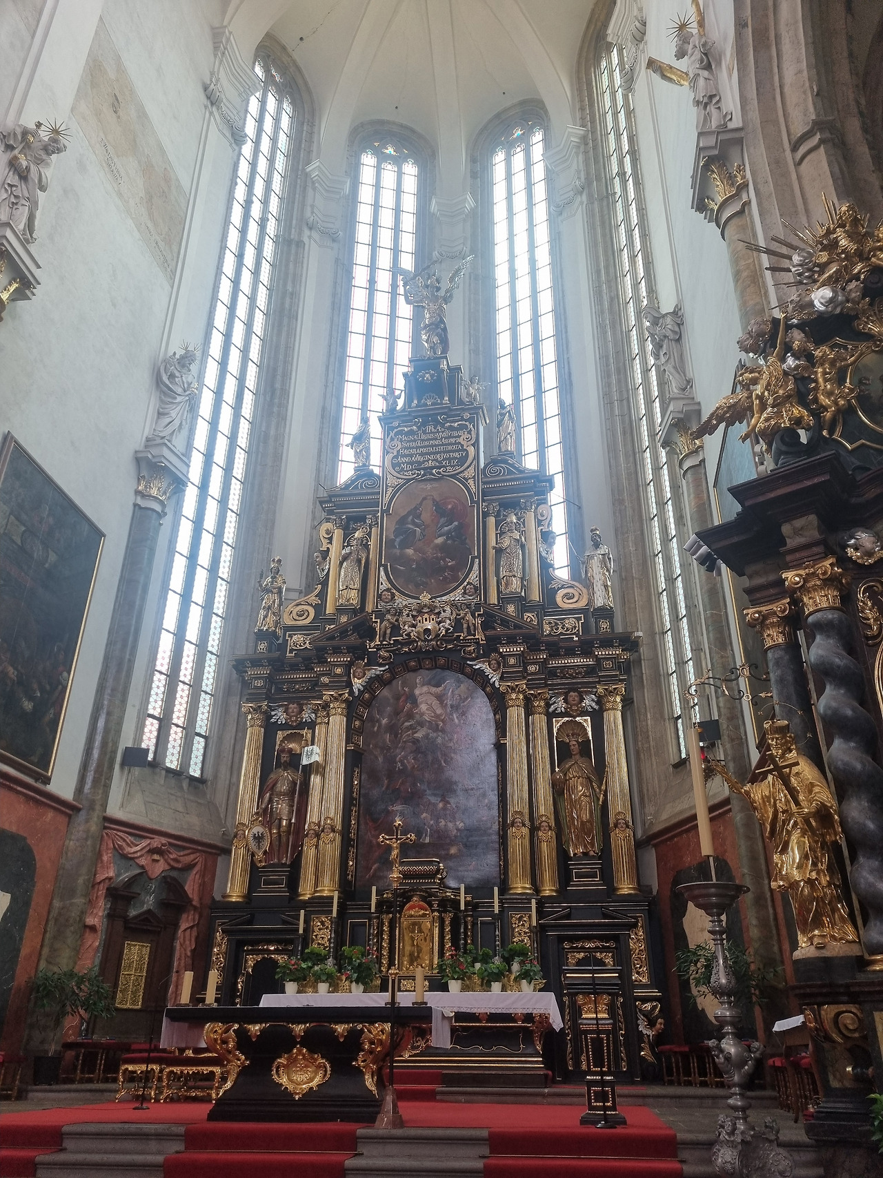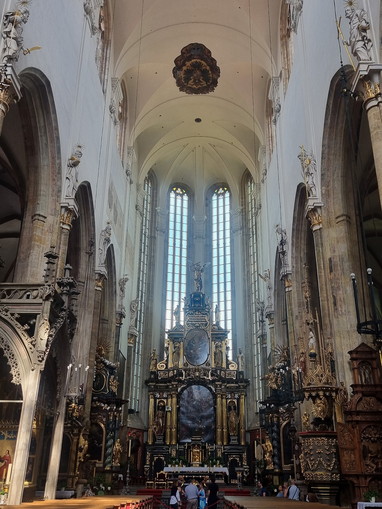 시계의 알림이 끝나니 그 많은 사람들은 어디론가 자신의 길을 떠나 흩어졌다. 우리는 구시가 광장 옆에 있는 틴 성당으로 향했다. 외관은 고딕 양식이고 80m나 되는 -아담과 이브라는 이름이 붙은- 두 개의 첨탑이 구시가 어디에서나 보여 금방 찾을 수 있었는데, 입구가 보이지 않았다. 뒤로 돌아가면 있으려나 한 바퀴 돌았는데도 못 찾겠다. 그러다 레스토랑 건물과 국립미술관이 있는 궁전 사이 골목 안쪽에 입구가 있었다. 성당 주변에는 옛날에도 있었을 것 같은 집들이 그대로 있었다. 그래서 입구 찾기가 어려웠나 보다. 마침 성당 개방 시간이어서 내부를 들여다볼 수 있었다. 내부는 바로크 스타일로 엄청 화려하다. 옛날 왕실의 영묘로 쓰인 성당이라 왕족과 대주교의 관이 있다. 특이한 건 천문학자 티코 브라헤의 관도 있다고 한다. 성당 안은 왠지 모르게 엄숙하고 숙연해진다.