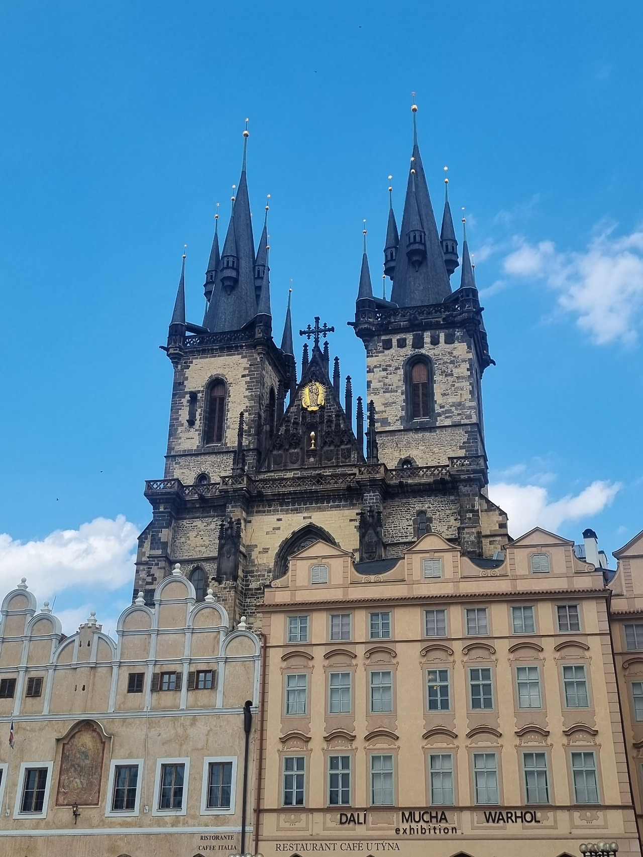 틴 성당의 공식 명칭은 틴 앞의 성모교회다. 틴은 체코말로 '담을 두른 공간'으로 영어 타운과 같은 뜻이라고 한다. 예전 틴 마당은 시장이었다. 11세기에는 광장 인근 틴 안뜰로 오는 외국 상인들을 위래 로마네스크 양식의 교회가 있었는데, 이후 틴 성당으로 대체되었다고 한다. 시커멓게 풍화한 외벽이 틴 성당의 오래된 역사를 보여주는 듯하다. 보헤미아가 수많은 전쟁에 휘말렸는데도 프라하는 참화를 피해 구시가의 중세 건축물과 신시가의 바로크 스타일 집들이 파괴되지 않고 제 모습을 유지할 수 있었다고 한다. 중세의 모습을 그대로 담고 있는 프라하에 관광객이 많은가 보다.
