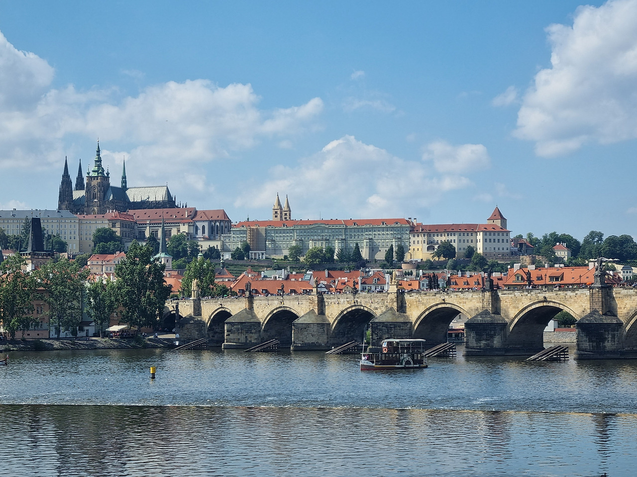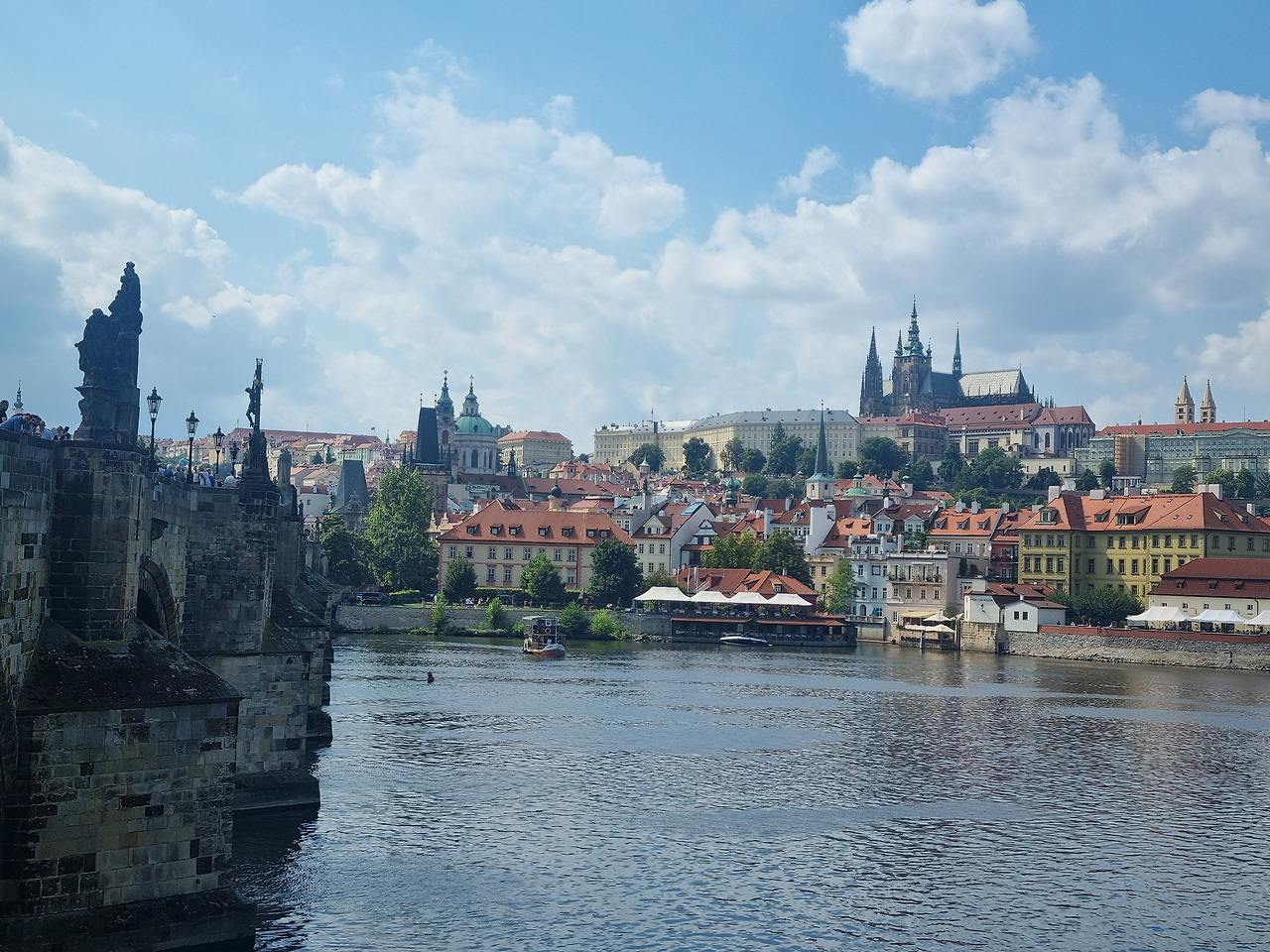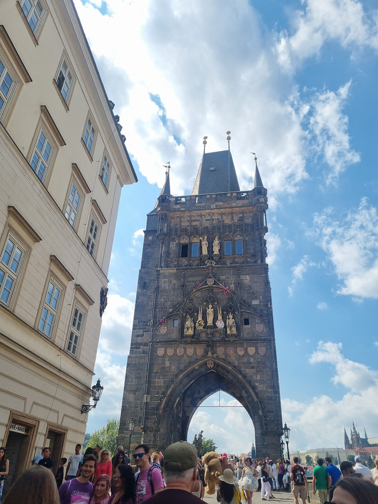 저 멀리 카렐교가 보인다. 신성로마제국의 황제이자 보헤미아 왕국의 국왕인 카렐 4세의 명으로 1357년에 건설하여 1402년에 완공되었다. 1841년까지 프라하 구시가지와 프라하성 일대를 연결하는 유일한 다리였다. 다리 앞 교탑은 지어졌을 때 그 모습 그대로 자리를 지키고 있는 듯 오래돼 보였다. 입장료를 내고 옥상에 올라 카렐교의 전경을 볼 수 있다. 해질 무렵 예쁜 다리의 모습을 찍기 위해 많은 사람들이 방문하여 설 자리가 없을 지경이라고 한다. 다리 위에는 버스킹을 하는 사람들, 다리를 건너는 사람들, 사진을 찍는 사람들로 발 디딜 틈이 없어 보였다. 내일 프라하성을 갔다 오는 길에 다리를 건널 예정이라 오늘은 잠시 미루었는데, 지현언니는 엄청 기대에 부풀어 가보고 온다 하여 남은 우리는 카렐 4세 동상 앞에서 사진을 찍으며 잠시 기다렸다.