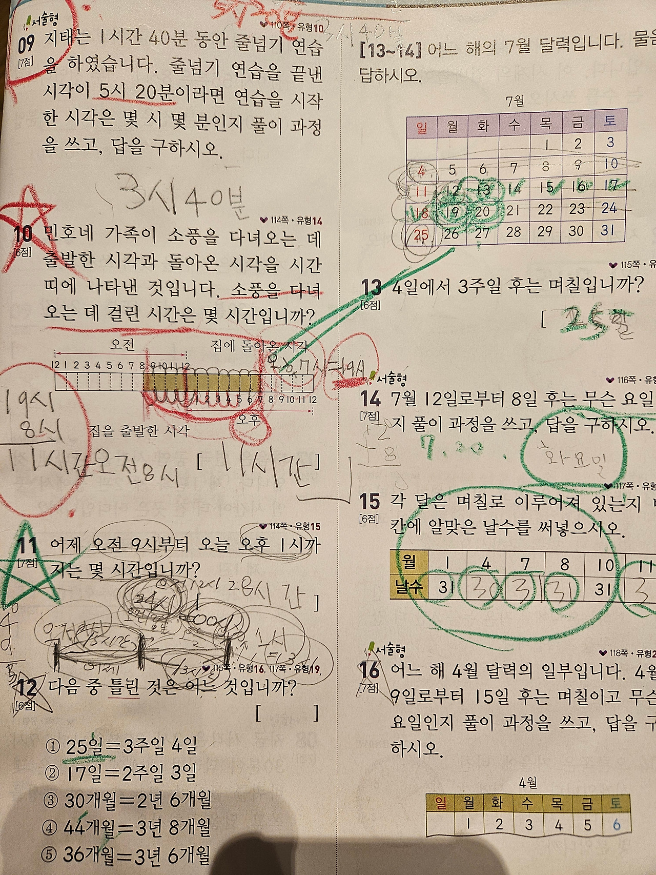 연산 학습지로 개념을 설명하면서 계산이 익숙해질 때까지 여러 번 반복한다. 그 후 기본 개념 문제를 풀고 응용, 심화로 나가야 한다. 여기서 또 어려운 점이 있다. 시각과 시간은 문장제 글밥 자체가 수준이 어렵다. 특히 언어가 취약한 준이에게는 문제를 읽고 이해하는 것 자체가 도전이다. 그래서 엄마는 계속 옆에서 같이 문제를 읽고 의미를 생각해보고, 이야기 나누는 과정을 반복한다.