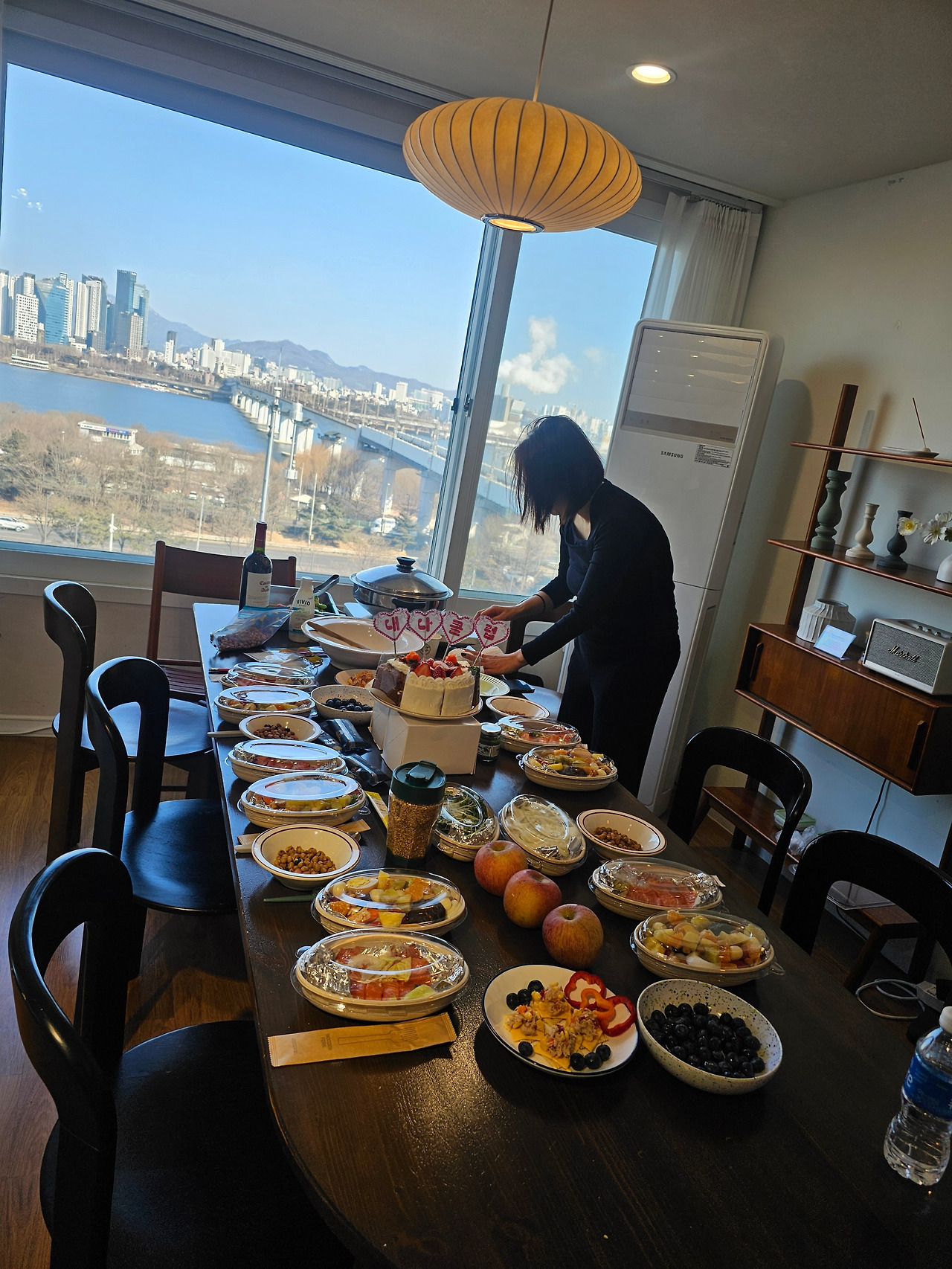 한강뷰가 펼쳐진 공간. 명찰은 없었지만, 서로를 직감적으로 알아볼 수 있었다. 각자 준비한 음식을 세팅하고, 서로의 정성을 칭찬하며 축배를 들었다.