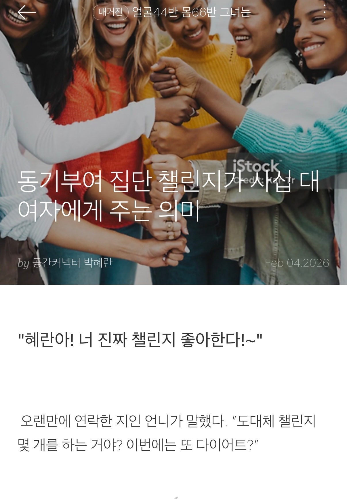 그날 우리의 대화는 운동과 식단을 넘어섰다. 여기까지 오는 과정에서의 삶, 각자의 현주소를 나누기 시작했다. 놀라웠다. 일대일로 만날 때는 듣지 못했던 이야기들이 쏟아졌다. 여러 명이 만드는 시너지, 안전지대의 편안함이 그녀들의 입을 열게 한 것이었다.