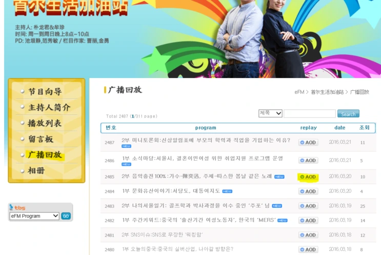 다시 듣기 : TBS 웹사이트 http://www.tbs.seoul.kr/efm/SeoulLife/replay.jsp#none >> 广播回放(다시 듣기)