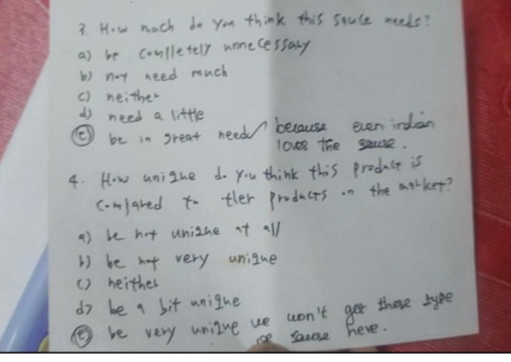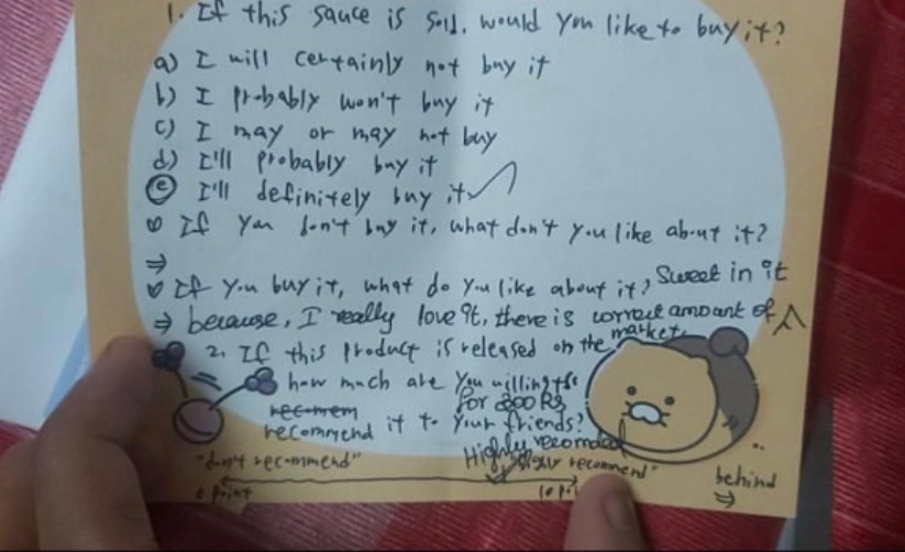 가장 중요한 설문지도 넣었다. 7명 모두에게 일일이 손으로 직접 썼다. 이 피드백을 제품에 반영하여 완제품을 생산할 계획이었다. 가장 먼저 구매의향을 물었다. 이 제품이 시중에 판매된다면 이 제품을 구입할 의향이 있는지 5점 척도로 표시하게 했다. 긍정적 응답자에게는 구매 이유를, 부정적 응답자에게는 구매하지 않는 이유를 서술해줄 것을 요청했다. 뒤이어 이 제품을 다른 친구들에게 추천할 의향이 얼마나 되는지를 물어보고, 제품의 필요성과 차별성을 질문했다.