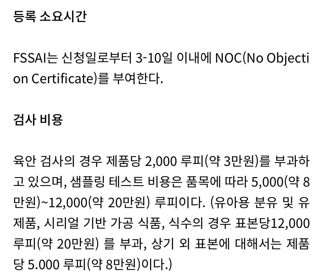 그렇지만 인도 외부 사업자와 협업하여 입점하는 경우, FSSAI 인증까지 받을 필요는 없다. 인도 회사가 이미 FSSAI 인증 자격을 보유하고 있기 때문이다. 다만, 식품 샘플링 검사를 하고 이에 대해 적합 판정을 받아야 수출이 가능하다.