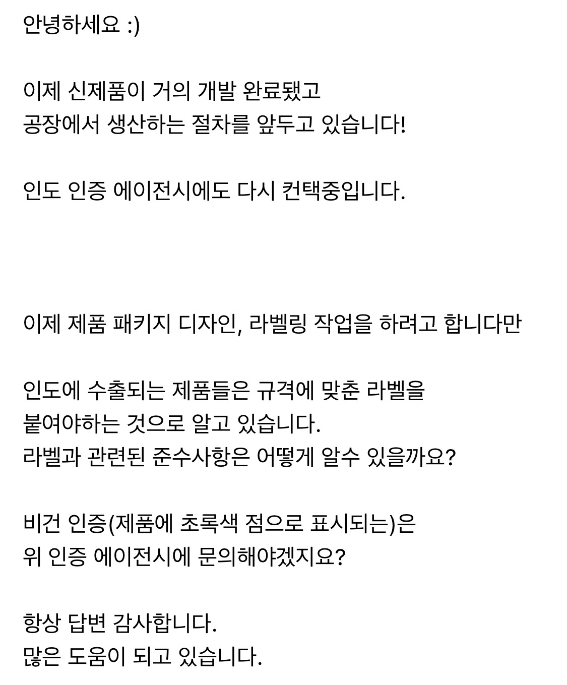 그런데 아무리 기다려도 인증 에이전시로부터 답변이 오지 않았다. 사실 이 에이전시는 전에도 문의메일에 답을 하지 않았다. 제품을 개발하면서 인도에 허가되지 않는 원료가 무엇인지 알고 싶어서 두세차례나 문의메일을 보냈지만 묵묵부답이었다. 그렇지만 이번에는 구체적으로 원료 리스트를 보냈으니 답변을 받을 수 있을거라고 생각했다. 그런데 여전히 답변이 없었다.
