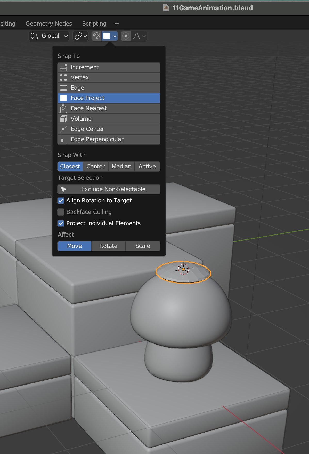 G키 선택후 Ctrl을 누르면 표면에 달라붙으며 이동한다. (상단 자석 Snap to Face Project)