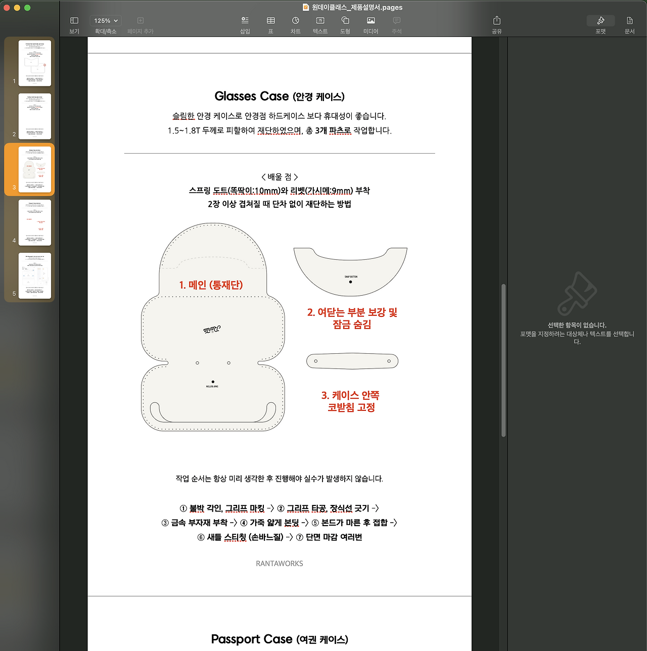 클래스 첫 시간에는 우리가 사용하는 가죽의 종류와 생산과정, 새들스티치에 대한 설명을 해드리며, 인쇄물도 따로 챙겨드립니다. 아래 처럼 클래스 제품별로 배울점과 작업 순서를 적은 인쇄물도 잊지 않습니다. 별 것 아닌 것 같지만 가져가시면 나중에 봐도 기억이 분명 나거든요. 체험클래스라고 허투루 하지 않는다는 것!!