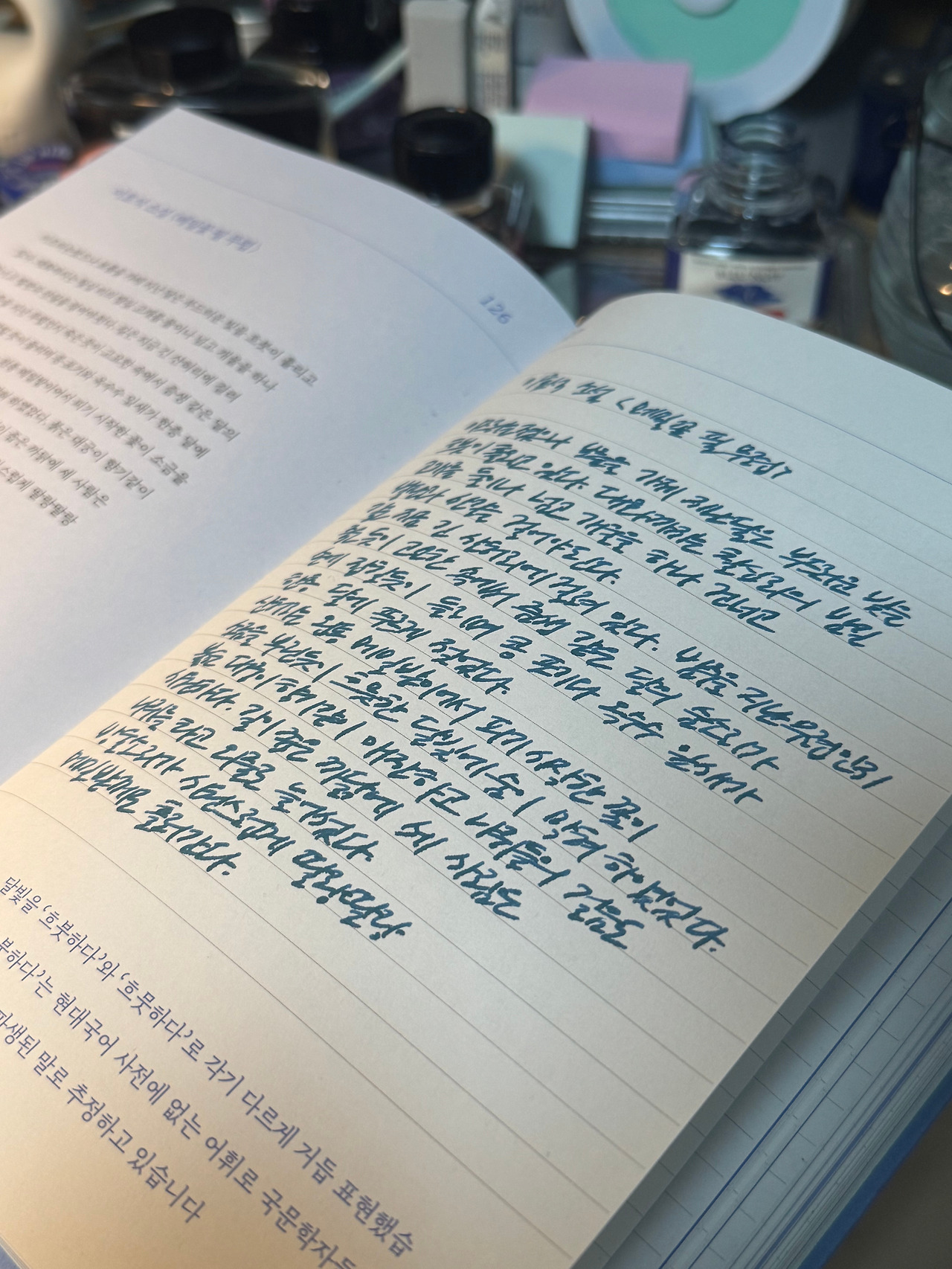 F닙은 제가 좋아하는 태필에 딱이에요. 잉크 흐름이 부드럽고, 연성은 아니지만 낭창낭창한 닙이라 글씨 쓸 때 즐겁습니다. 펜마다 잉크색이 다른데 사진은 죄다 블루만 찍었네요. 다음에 여러가지 보여드릴 수 있으면 좋겠습니다.
