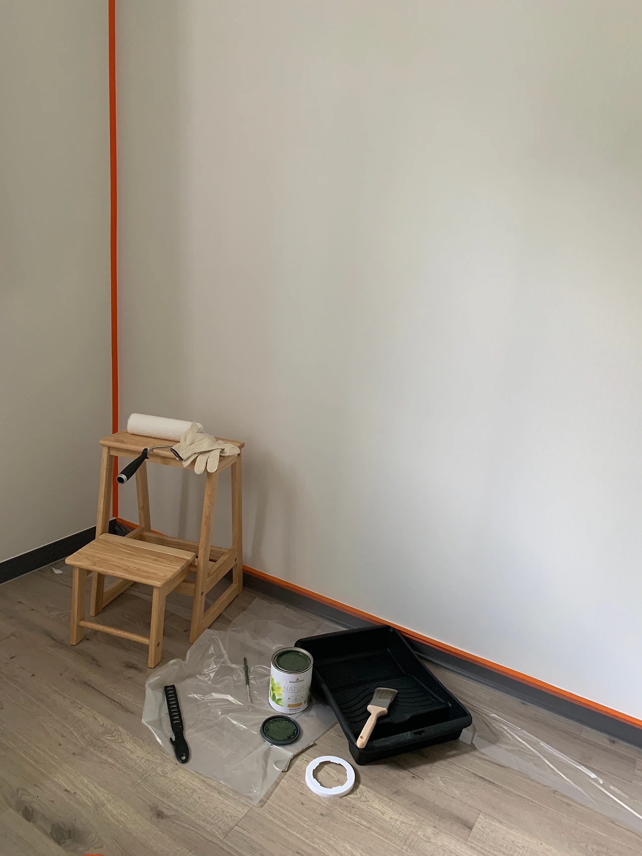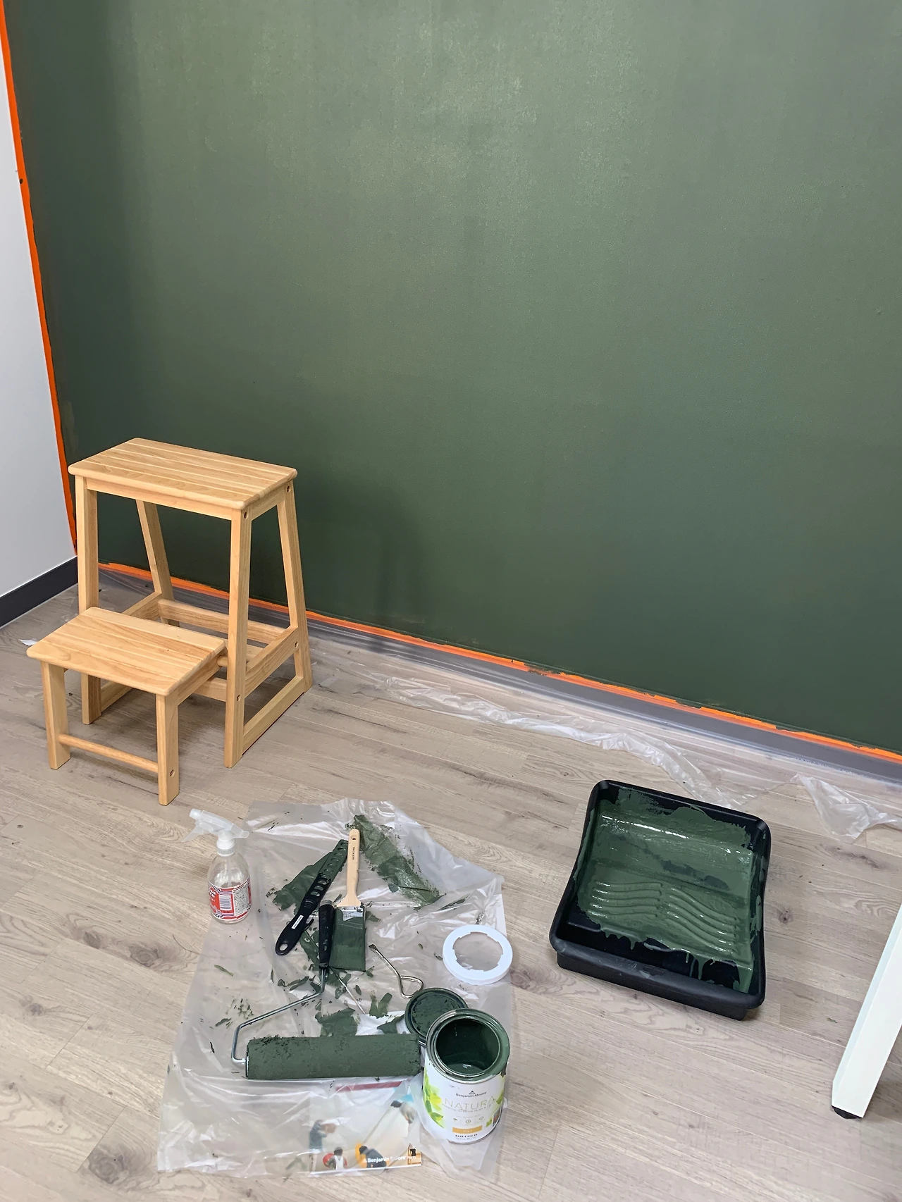 외부 작업실을 임대하지 않는 대신 충분히 만족스러운 공간으로 만드는게 우선이어서 페인트칠과 시스템 선반은 꼭 해야겠다 생각했습니다. 녹색계열로 하고 싶었는데 채도 낮은 그레이톤에 가까웠으면 해서 벤자민무어 빈티지보그(Vintage Vogue)로 골랐어요. 팔이 좀 아팠지만 몇 번 해본 짬밥이 있어서인지 어렵지 않았고 1회 도포후 한 시간 후에 다시 도포했습니다.