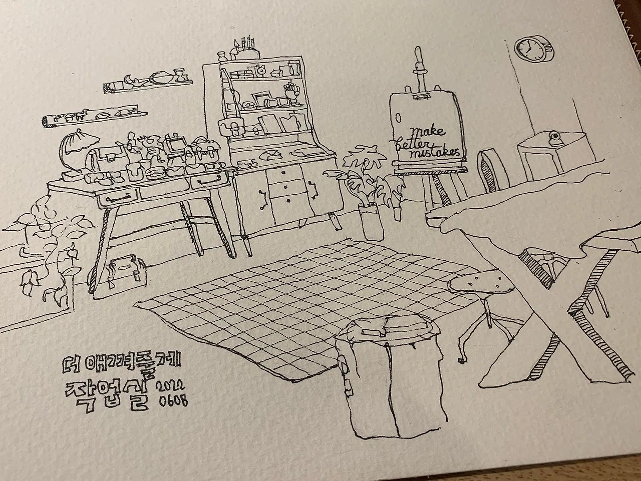 지난주 그림 모임 주제는 '가장 많은 시간을 머무는 장소 또는 좋아하는 장소' 였고, 당연히 저는 작업실을 그렸습니다. 영상으로 올려봤어요 좀 비슷한가요? ㅎㅎ