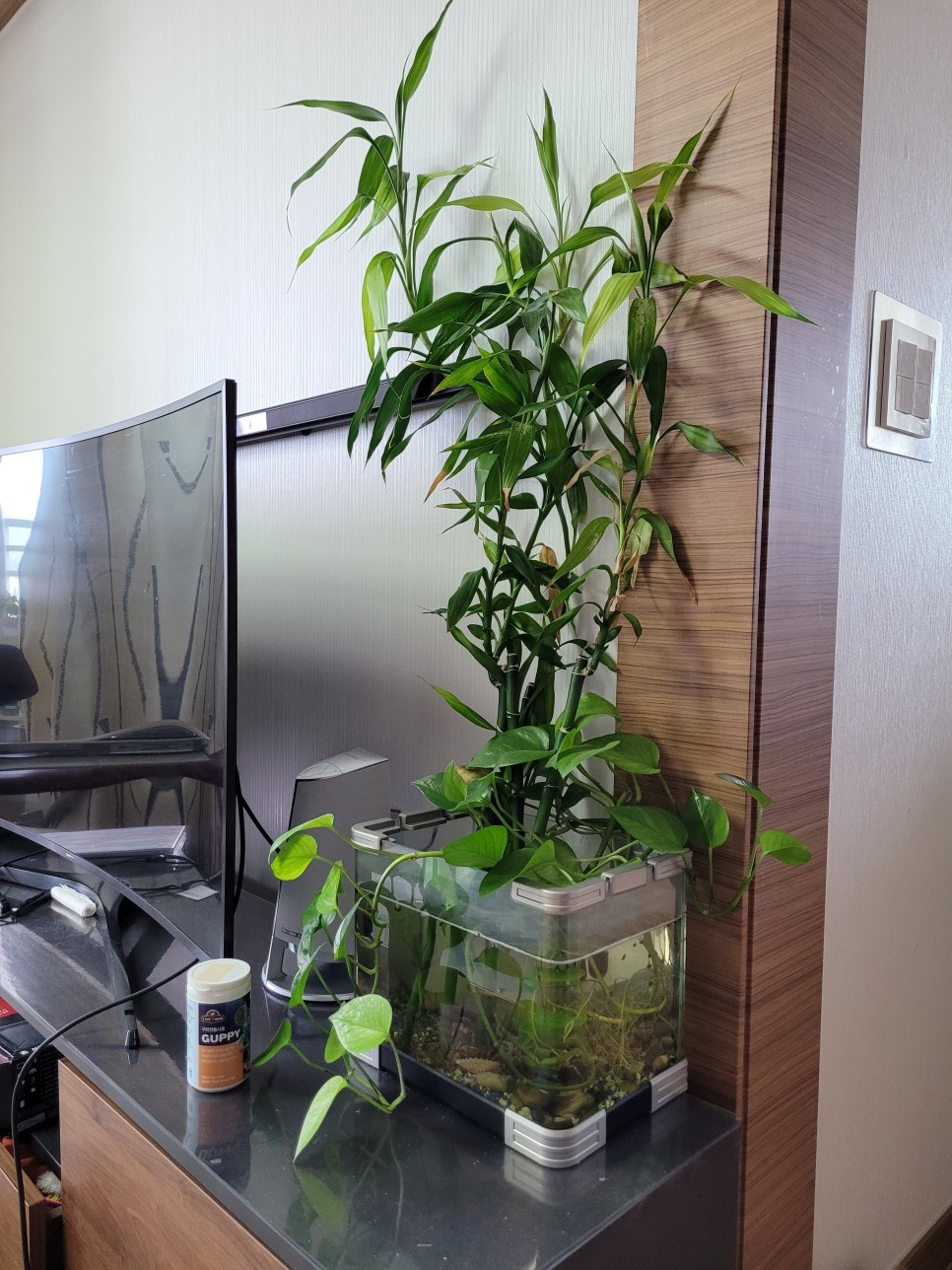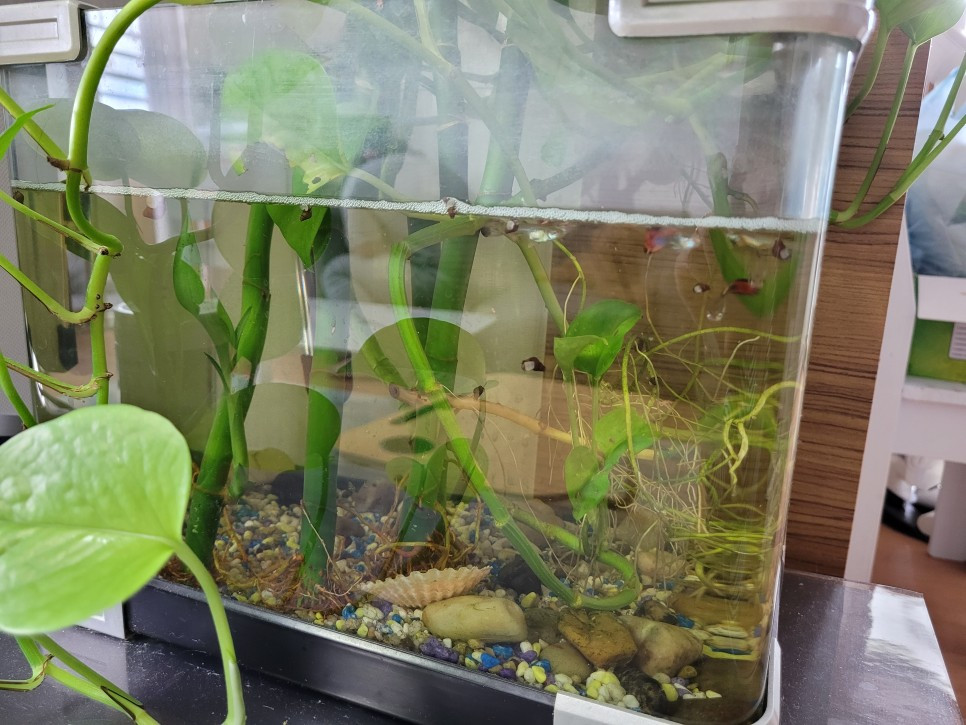 구피를 여과기랑 산소발생기 없이 키우고 있습니다. 별도의 장치 없이 물고기를 키울 수 있는 비법은 바로 식물입니다. 개운죽과 스킨답서스를 수초 대신 수경재배로 키워서 식물도 보고 물고기도 관상하는 1석 2조의 효과를 봅니다.