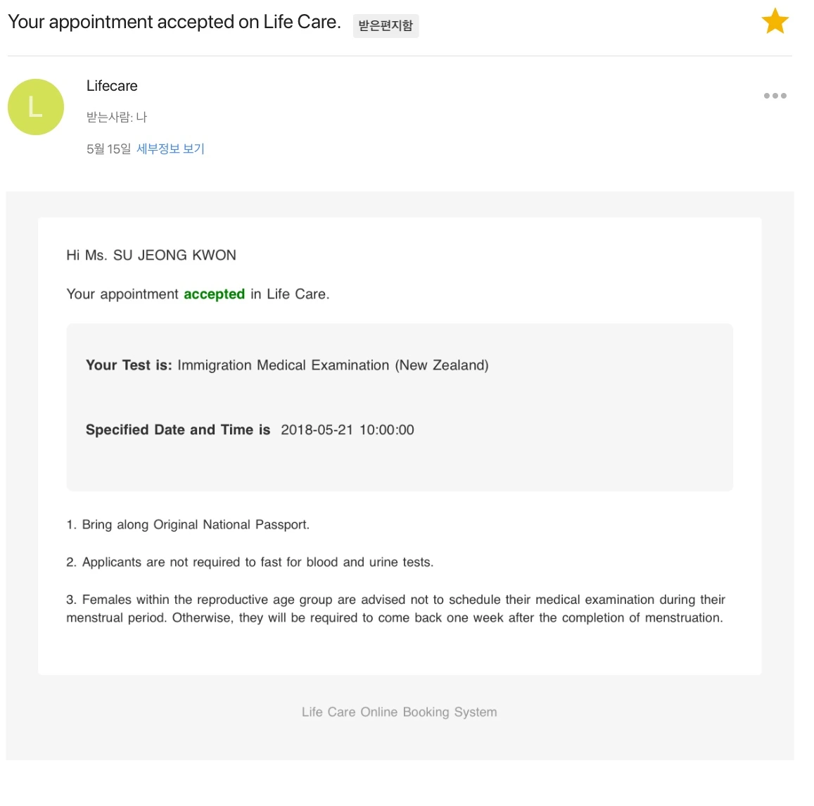 5. 신체검사를 받기 위해 인근 병원으로 예약 후 검사를 받는다. (해외에서도 받을 수 있음)